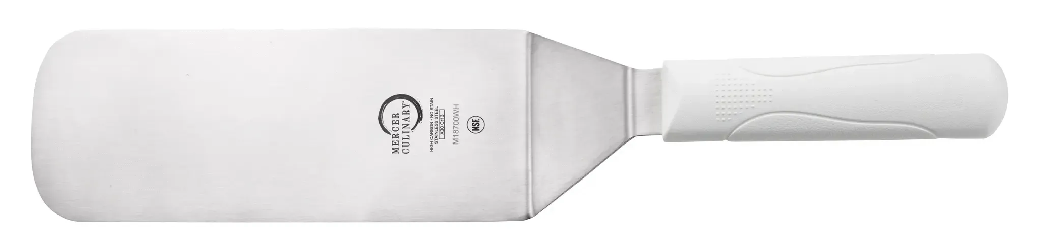 Elevate culinary creations with the Mercer Culinary, M18700WH, Turner, Solid, Stainless Steel. This 8" x 3" turner is designed to meet the demands of a commercial restaurant setting. Its solid stain-resistant stainless steel blade ensures durability and longevity, making it perfect for heavy-duty use. The 14-3/4" overall length provides excellent control and maneuverability, allowing chefs to flip and turn food with ease. The white molded polypropylene handle not only offers a comfortable grip but also meets HACCP guidelines, making it suitable for dedicated use in different food preparation areas. With NSF certification, this turner guarantees food safety and sanitation. Whether you're flipping burgers on the grill or sauteing vegetables on the stovetop, this Mercer Culinary turner is a reliable tool that will enhance your culinary creations.