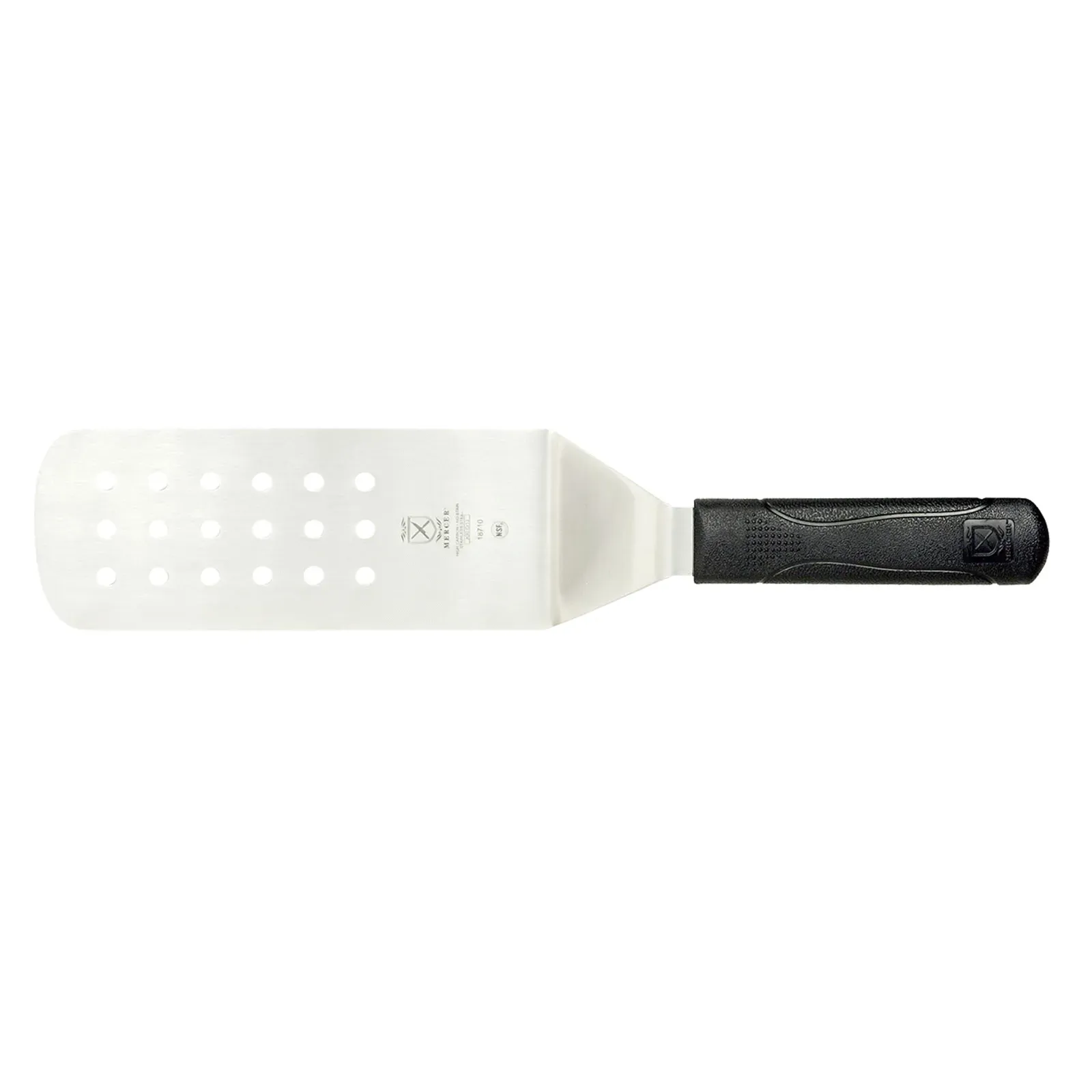 Optimize kitchen efficiency with the Mercer Culinary, M18710, Turner, Perforated, Stainless Steel. This 8" x 3" turner is a must-have tool for any commercial restaurant. Its perforated stain-resistant stainless steel blade allows for easy draining of excess liquids, making it perfect for flipping delicate foods like fish or draining grease from fried items. The 14-3/4" overall length provides ample reach, while the black molded polypropylene handle ensures an extra-sure grip, even in busy kitchen environments. With NSF certification, you can trust the quality and safety of this turner. Whether you're a professional chef or a restaurant owner, this Mercer Culinary turner is designed to withstand the demands of a commercial kitchen, making it a reliable and durable choice for your restaurant.