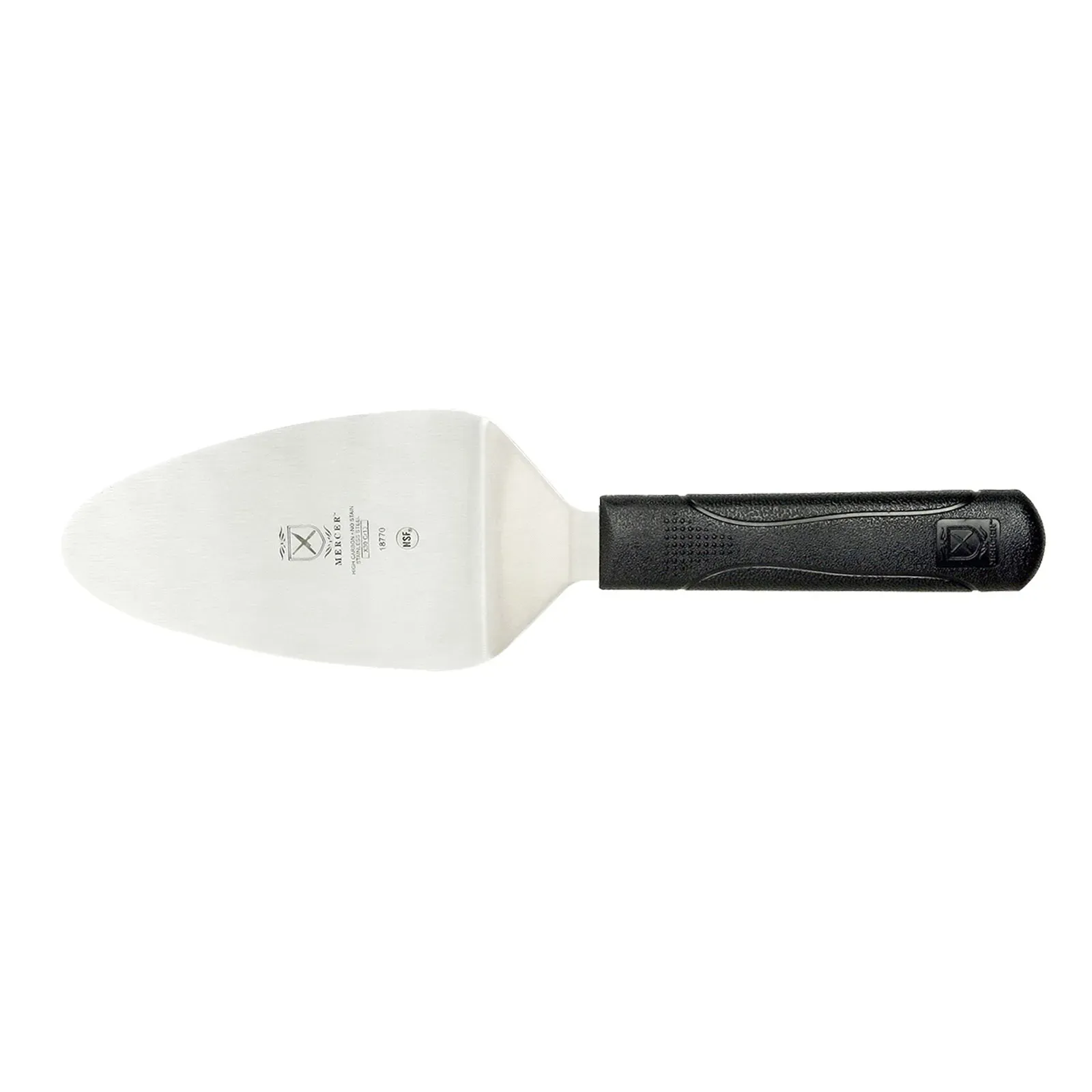Enhance culinary precision with the Mercer Culinary, M18770, Pie / Cake Server. This 5" x 3" Pie Server is a must-have tool for any commercial restaurant. With its stain-resistant stainless steel blade and black molded polypropylene handle, it offers an extra-sure grip, ensuring efficient and precise slicing and serving of pies and cakes. The 11" overall length provides the perfect balance of control and maneuverability, making it easy to serve even the most delicate desserts. Designed with the needs of professional chefs in mind, this Pie / Cake Server is NSF certified, guaranteeing its safety and durability in a commercial kitchen environment. Trust Mercer Culinary for high-quality, reliable tools that enhance your culinary creations.