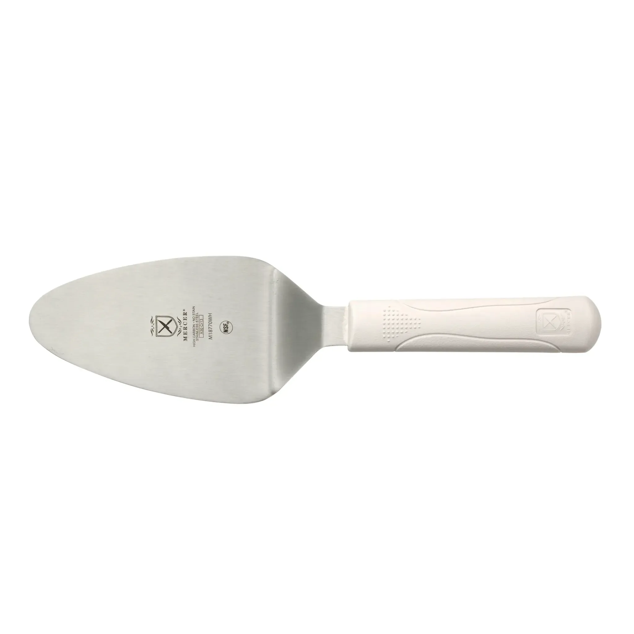 Equip your kitchen for success with the Mercer Culinary, M18770WH Pie / Cake Server. This 5" x 3" server is perfect for commercial restaurant use, allowing you to effortlessly slice and serve pies and cakes with precision and style. The stain-resistant stainless steel blade ensures durability and easy cleaning, while the white molded polypropylene handle provides an extra-sure grip, even in busy kitchen environments. With an overall length of 11", this server offers optimal control and maneuverability. The NSF certification guarantees the highest standards of safety and hygiene. Whether you're serving up delicious desserts or creating beautiful pastry displays, the Mercer Culinary Pie / Cake Server is a must-have tool for any commercial kitchen.