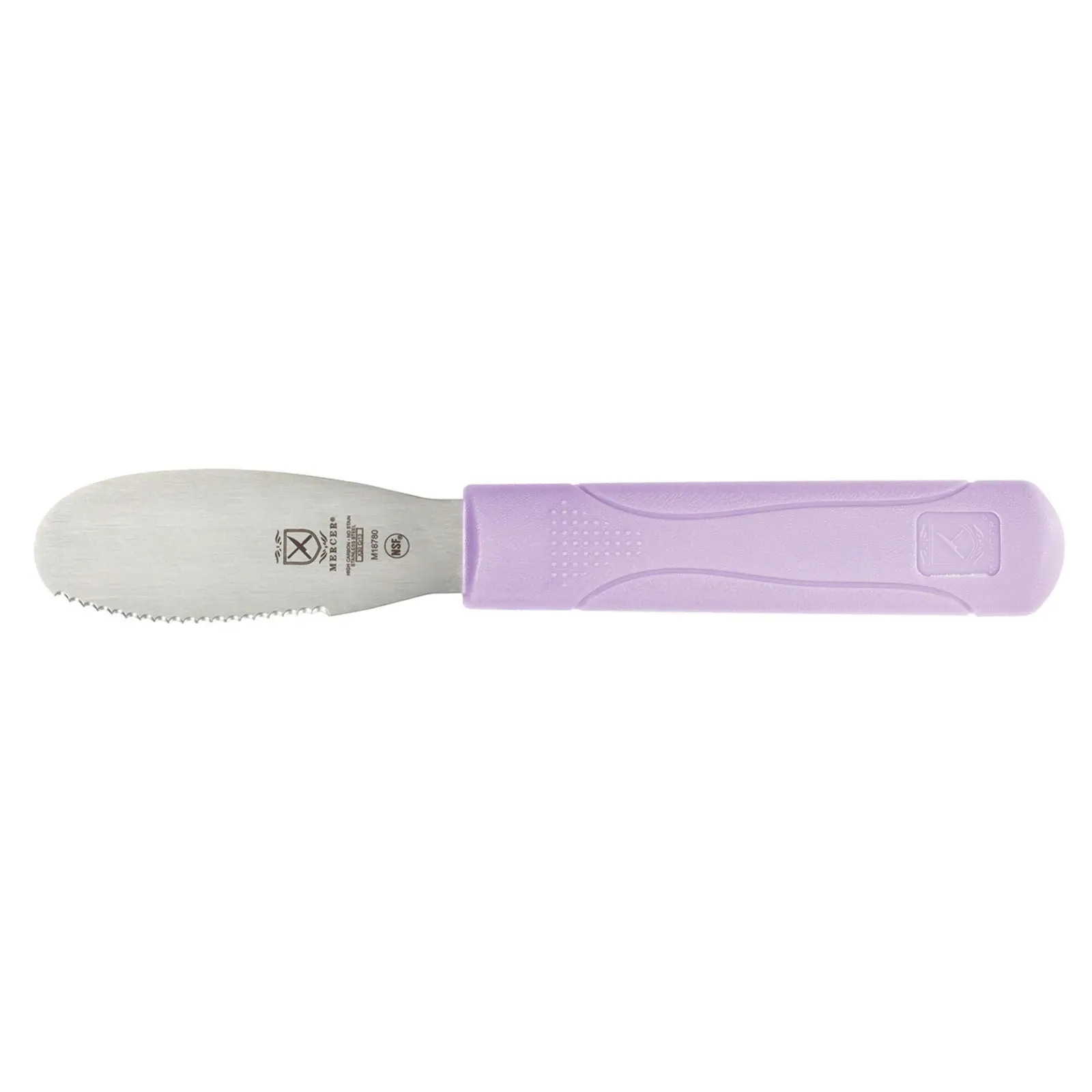 Enhance culinary precision with the Mercer Culinary, M18780PU Sandwich Spreader. This sandwich spreader is designed to meet the demands of a commercial restaurant setting, offering exceptional performance and durability. The 3-1/2" wavy edge blade is made from stain-resistant stainless steel, ensuring long-lasting sharpness and easy maintenance. The molded polypropylene handle provides a comfortable grip, allowing for precise spreading and effortless control. With its purple color handle, this spreader is an ideal choice for allergen, HACCP, or dedicated use options, making it a versatile tool in any kitchen. NSF certified, this sandwich spreader meets the highest standards of safety and hygiene. Elevate your sandwich-making game with the Mercer Culinary, M18780PU Sandwich Spreader and enjoy professional-quality results every time.