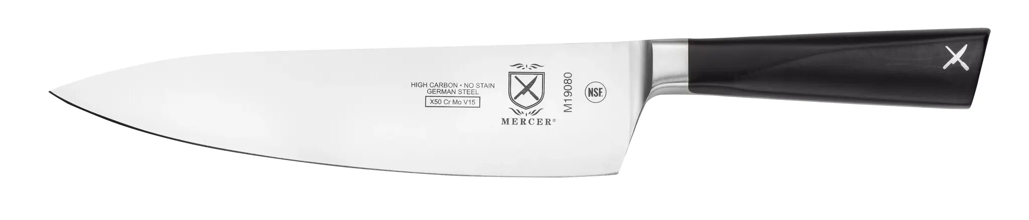 Enhance culinary precision with the Mercer Culinary, M19080, Chef's Knife. This 8" knife is a must-have tool for any commercial restaurant. Its one-piece precision forged design ensures durability and long-lasting performance, making it perfect for heavy-duty use in a busy kitchen. The high carbon, no-stain German steel blade provides exceptional sharpness and edge retention, allowing for precise and effortless cutting of various ingredients. The ergonomically designed POM handle offers a comfortable grip, reducing hand fatigue during extended use. NSF certified, this knife meets the highest standards of safety and sanitation. Elevate your culinary skills and efficiency with this exceptional chef's knife.