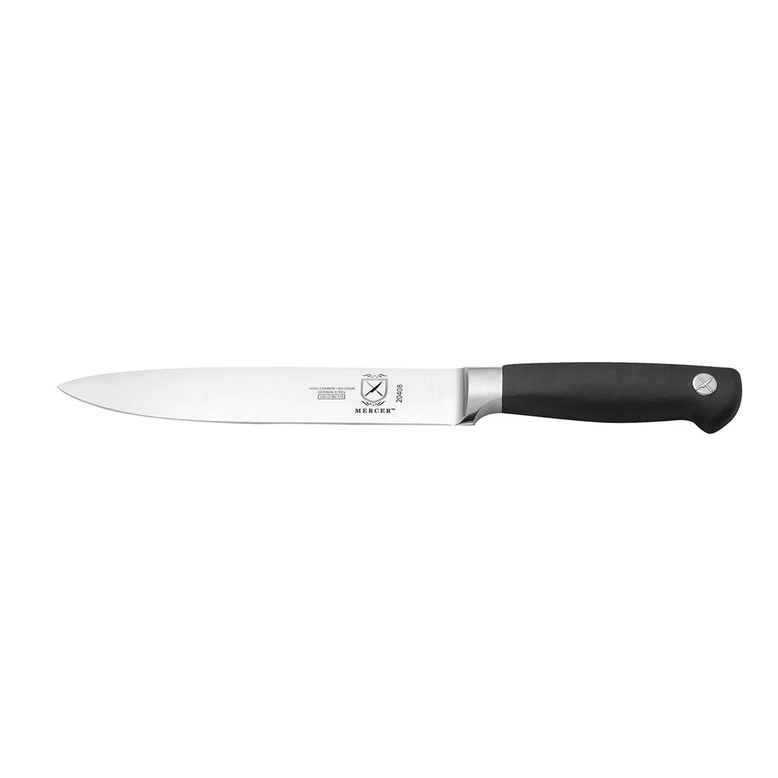 Elevate kitchen operations with the Mercer Culinary, M20408, Knife, Carving. This precision-forged 8" carving knife is designed to meet the demands of a commercial restaurant setting. Crafted from high carbon, no-stain German steel, it ensures exceptional durability and long-lasting performance. The black non-slip Santoprene handle provides a secure grip, allowing for precise control and reducing the risk of accidents. NSF certified, this knife meets the highest standards of safety and sanitation. Whether you're slicing roast beef, turkey, or ham, this knife delivers clean, uniform cuts every time. Trust Mercer Culinary for top-quality knives that enhance efficiency and productivity in your restaurant.