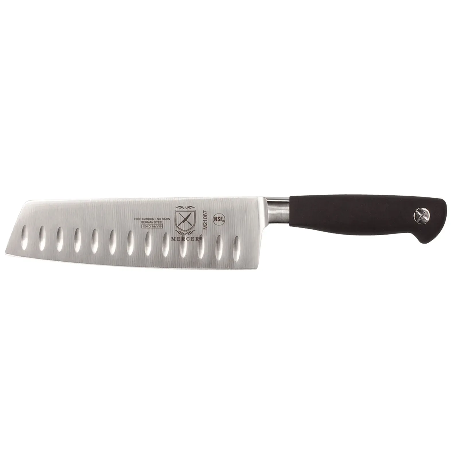 Optimize kitchen workflow with the Mercer Culinary, M21067, Knife, Asian. This 7" Nakiri knife is designed to enhance efficiency and precision in a commercial restaurant setting. The precision-forged, high carbon, no-stain German steel blade ensures exceptional durability and sharpness, allowing for effortless slicing and dicing of vegetables. The granton edge reduces friction and prevents food from sticking to the blade, resulting in clean and precise cuts every time. The black non-slip Santoprene handle provides a comfortable and secure grip, even when wet, ensuring safety and control during use. NSF certified, this knife meets the highest standards of quality and sanitation. Upgrade your kitchen arsenal with the Mercer Culinary, M21067, Knife, Asian, and experience the difference in performance and efficiency.