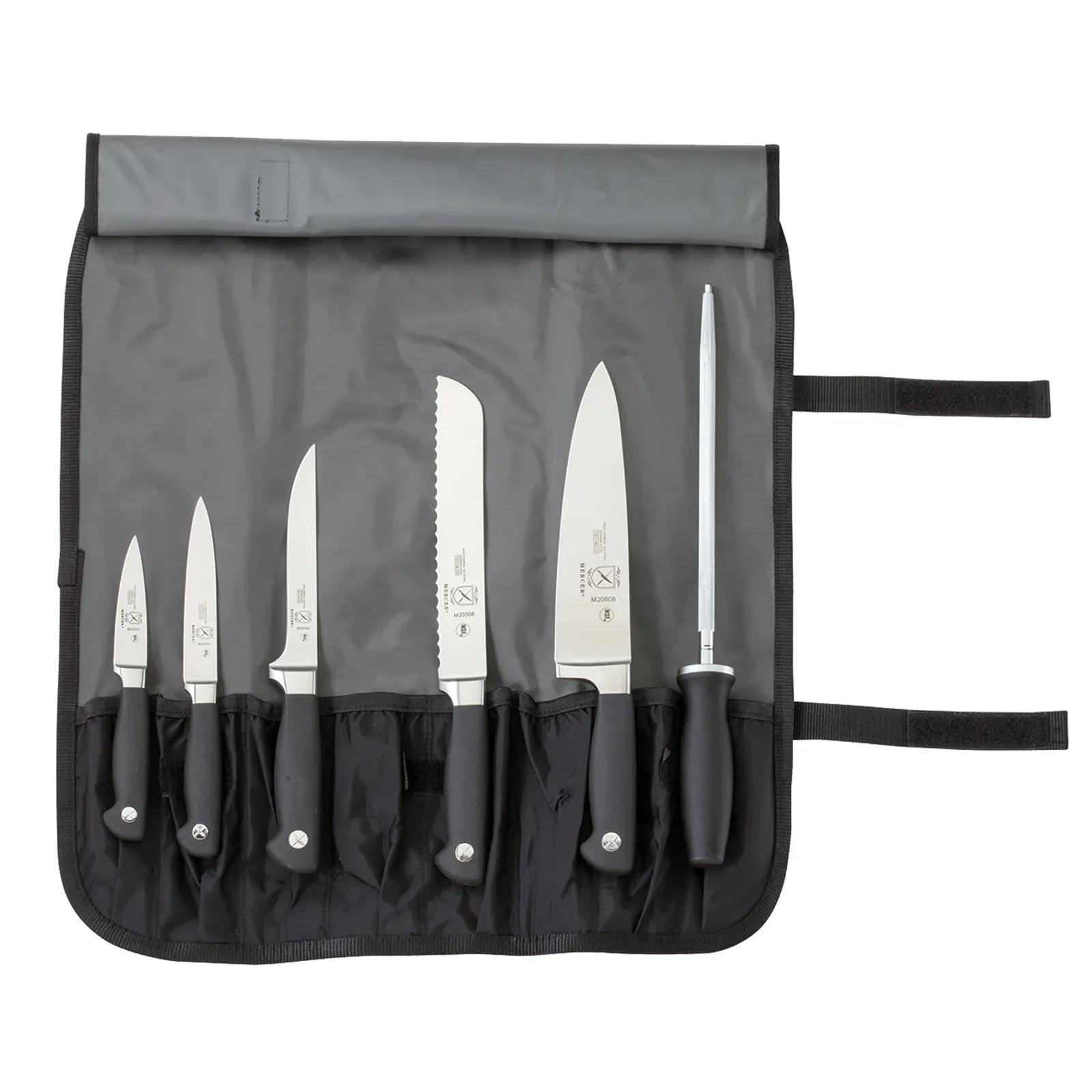 Upgrade culinary efficiency with the Mercer Culinary, M21800, Knife Set. This 7-piece Genesis Knife Roll Set is a must-have for any commercial restaurant. It includes a 7-pocket roll with a detachable, adjustable strap, ensuring easy and safe transportation of your knives. The set features high-carbon, no-stain German steel blades that are designed to withstand the demands of a busy kitchen. The black non-slip Santoprene handles provide a comfortable and secure grip, allowing for precise and effortless cutting. With a 3-1/2" paring knife, 5" utility knife, 6" boning knife, 8" chef's knife, 8" bread knife, and 10" sharpening steel, this set has all the essential tools for any culinary task. NSF certified, this knife set meets the highest standards of safety and hygiene. Elevate your restaurant's kitchen with the Mercer Culinary, M21800, Knife Set.