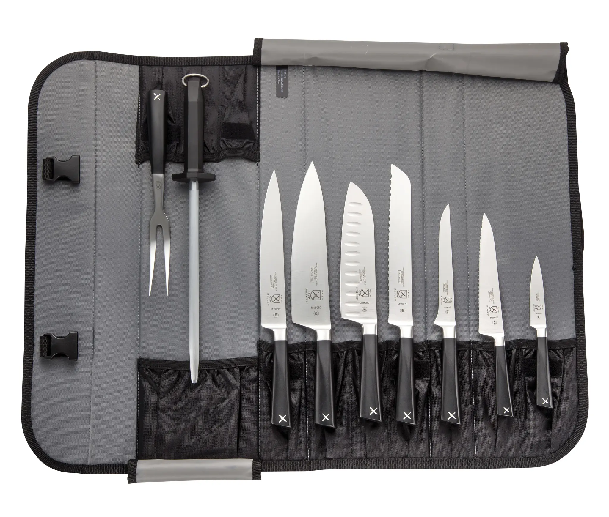 Boost kitchen experiences with the Mercer Culinary, M21840, Fork & Knife Set. This 10-piece knife case set is perfect for commercial restaurant use, providing everything you need to tackle any culinary task. The set includes a 3" paring knife, 6" wavy edge utility knife, 6" boning knife, 7" granton edge santoku, 8" wavy edge bread knife, 8" chef's knife, 8" carving knife, 6-1/4" carving fork, 10" sharpening steel, and a knife storage roll. Crafted with high-carbon, no-stain German steel blades, these knives offer exceptional durability and precision. The ergonomic POM handles ensure a comfortable grip, reducing fatigue during long hours in the kitchen. With a limited lifetime warranty, you can trust in the quality and longevity of these knives. Upgrade your restaurant's cutlery collection with the Mercer Culinary, M21840, Fork & Knife Set and elevate your culinary creations to new heights.