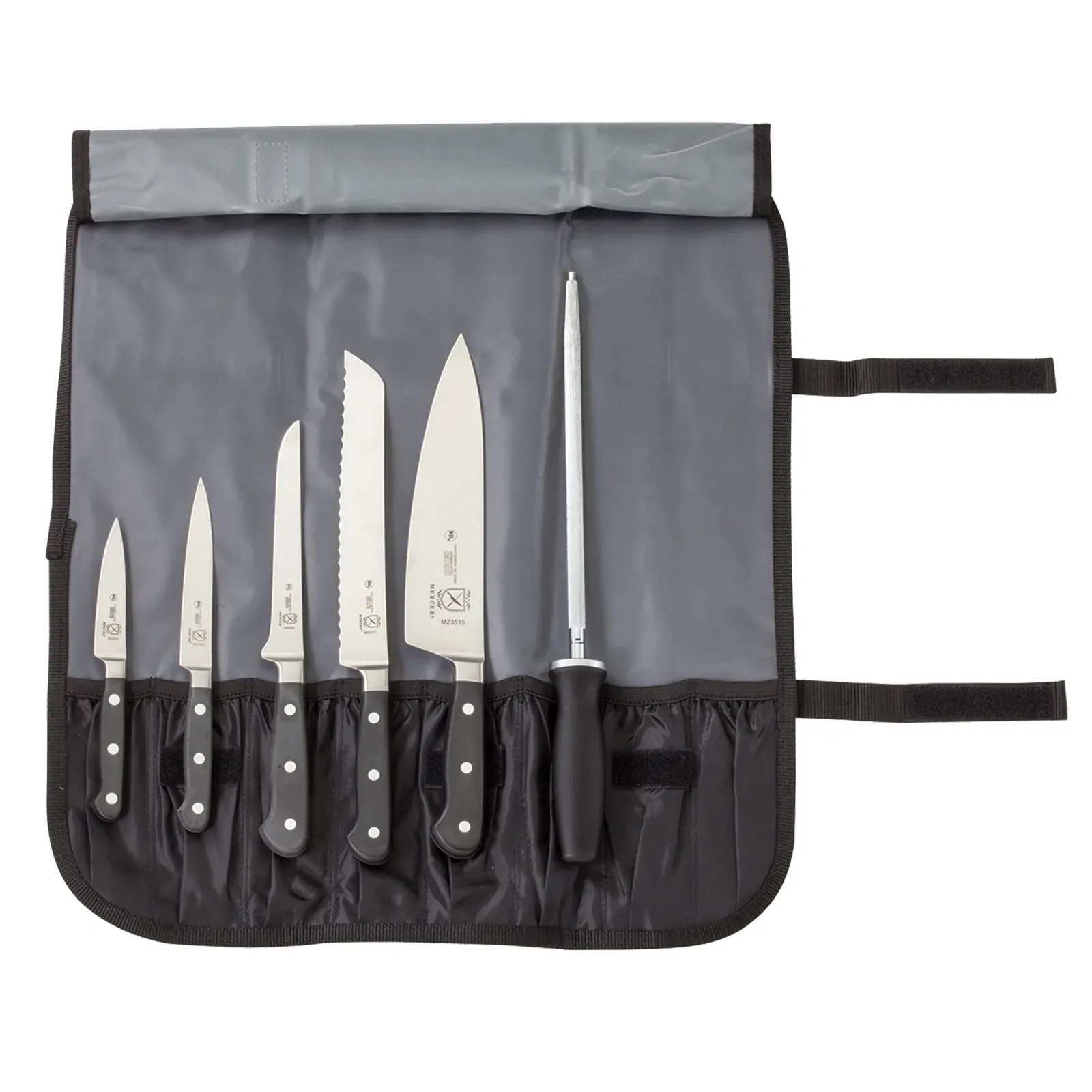 Equip your kitchen for success with the Mercer Culinary, M21850, Knife Set. This 7-piece knife roll set is perfect for commercial restaurant use. It includes a 7-pocket roll with a detachable, adjustable strap, ensuring easy and convenient transportation. The set features high-carbon no stain German steel blades that are known for their exceptional sharpness and durability. The ergonomic Delrin handles provide a comfortable grip, allowing for precise and effortless cutting. With a 3-1/2" paring knife, 5" utility knife, 6" boning knife, 8" bread knife, 8" chef's knife, and 10" sharpening steel, this set has all the essential knives for any culinary task. Whether you're slicing, dicing, or chopping, these knives will deliver outstanding performance. Trust Mercer Culinary to provide you with top-quality knives that will enhance your restaurant's efficiency and productivity.