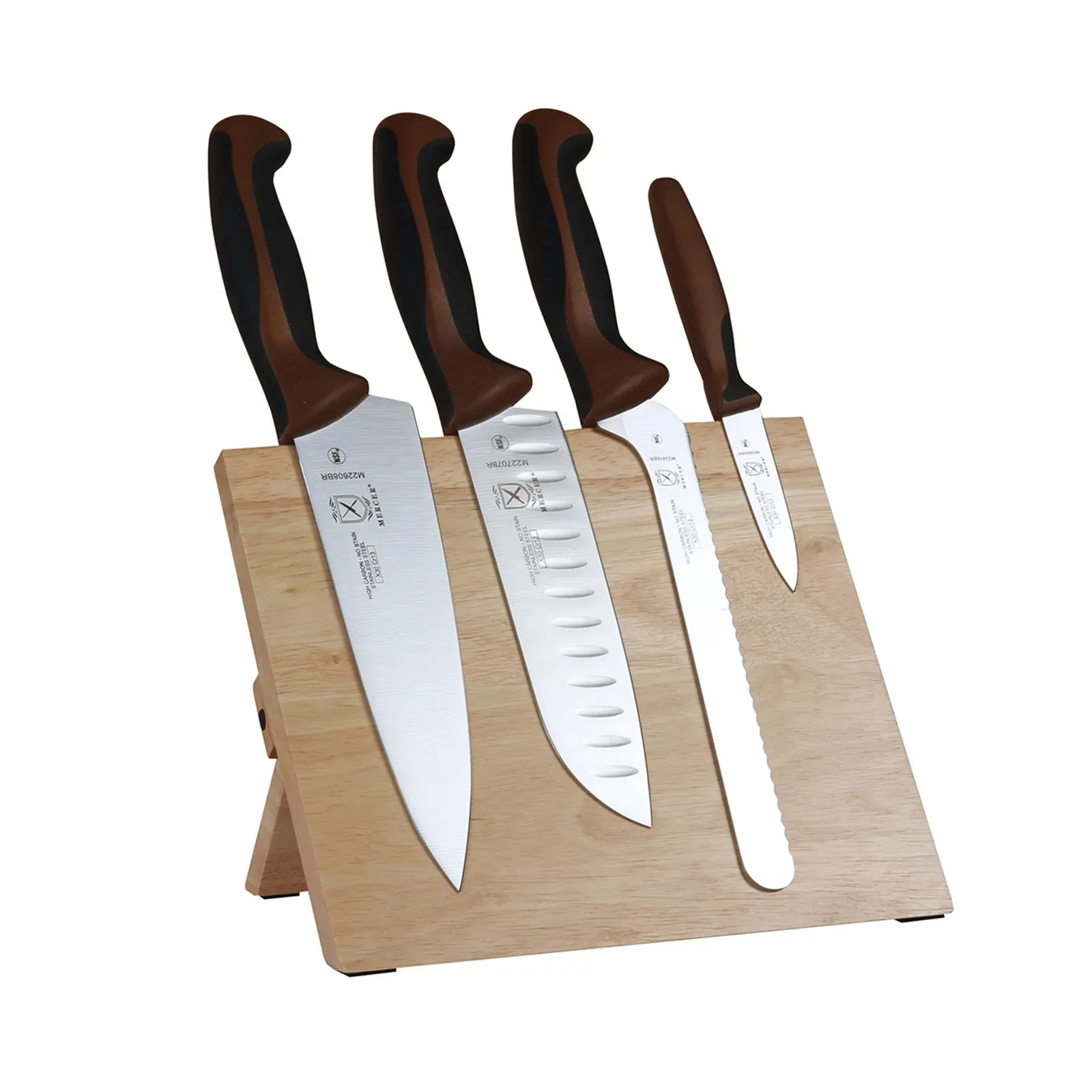 Optimize kitchen workflow with the Mercer Culinary, M21981BR Knife Set. This 5-piece set includes a bamboo magnetic board, an 8" chef knife, a 7" Santoku knife with a granton edge, a 3-1/2" slim paring knife, and an 8" offset, wavy edge bread knife. The Japanese stain-resistant steel blades ensure durability and precision, while the brown handles add a touch of elegance to any restaurant kitchen. The magnetic board keeps the knives organized and easily accessible, saving valuable time during food preparation. Whether you're slicing, dicing, or chopping, these knives provide the perfect balance and control. Upgrade your kitchen arsenal with the Mercer Culinary, M21981BR Knife Set and experience the difference in efficiency and performance.