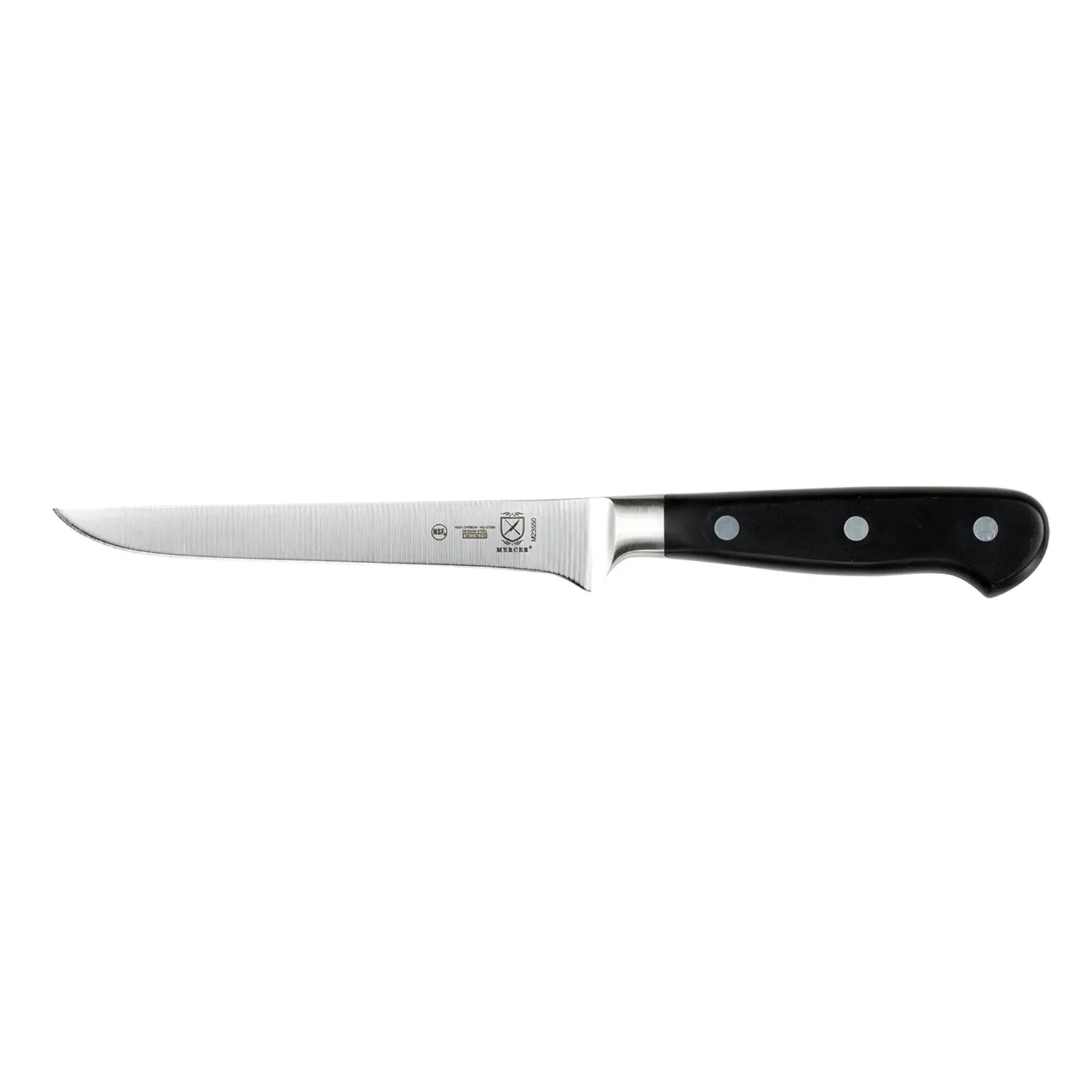 Optimize kitchen workflow with the Mercer Culinary, M23550, Knife, Boning. This 6" Boning knife is the perfect tool for commercial restaurant use. Its stiff blade allows for precise and efficient deboning of meat, ensuring maximum yield and minimal waste. Made from one-piece precision forged German steel, this knife is built to last and withstand the demands of a busy kitchen. The triple riveted construction provides added strength and durability, while the high carbon, no-stain steel ensures long-lasting sharpness and easy maintenance. The ergonomic Delrin handle offers a comfortable grip, reducing fatigue during extended use. NSF certified, this knife meets the highest standards of safety and sanitation.