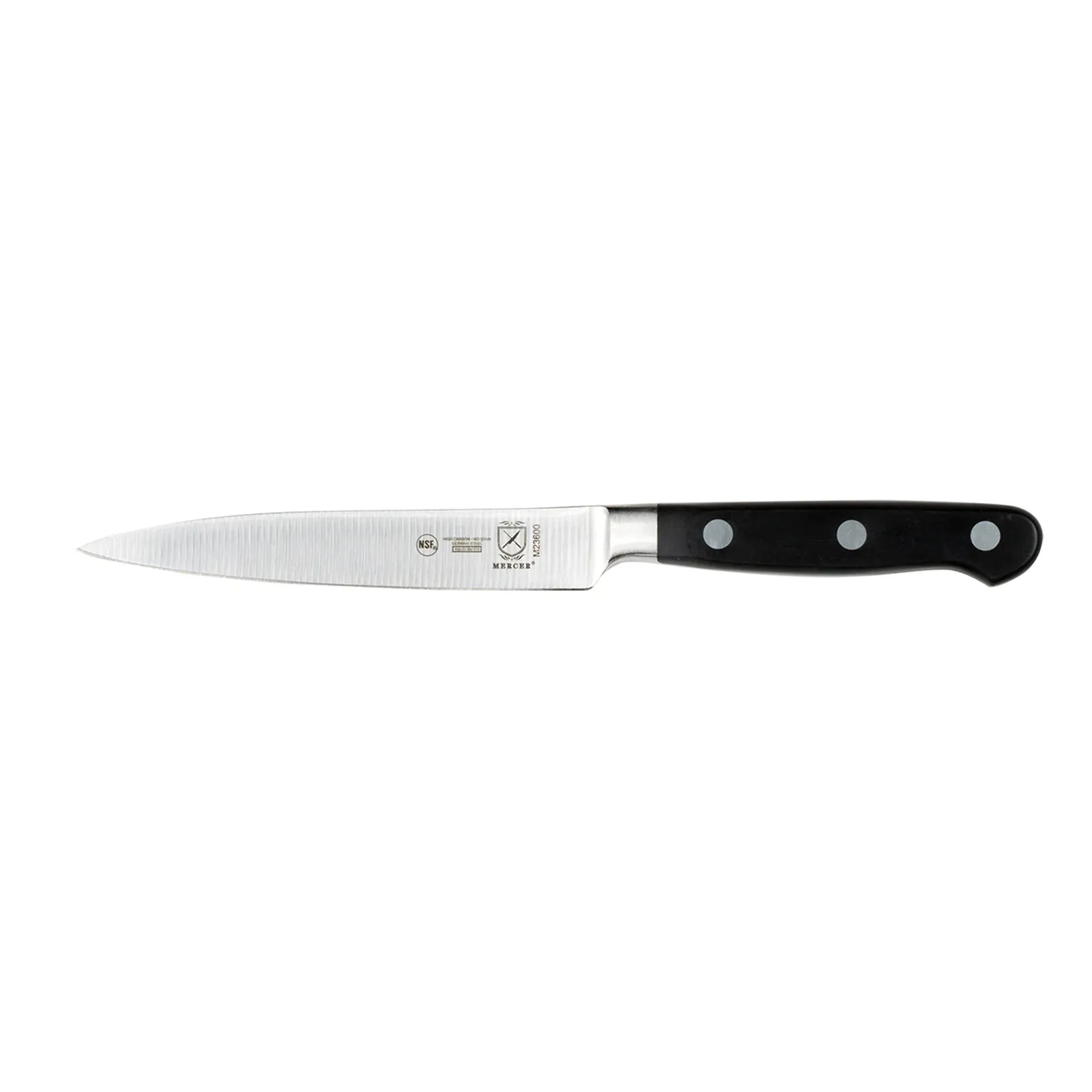 Maximize kitchen productivity with the Mercer Culinary, M23600 Utility Knife. This 5" knife is a must-have tool for any commercial restaurant. Its one-piece precision forged construction ensures durability and long-lasting performance, while the triple riveted handle provides a secure and comfortable grip. Made from high carbon, no-stain German steel, this knife delivers exceptional sharpness and edge retention, allowing for precise and effortless cutting. The ergonomic Delrin handle adds to the knife's comfort and control, reducing fatigue during extended use. NSF certified, this utility knife meets the highest standards of safety and sanitation in a professional kitchen. Upgrade your kitchen arsenal with the Mercer Culinary, M23600 Utility Knife and experience the difference in performance and efficiency.