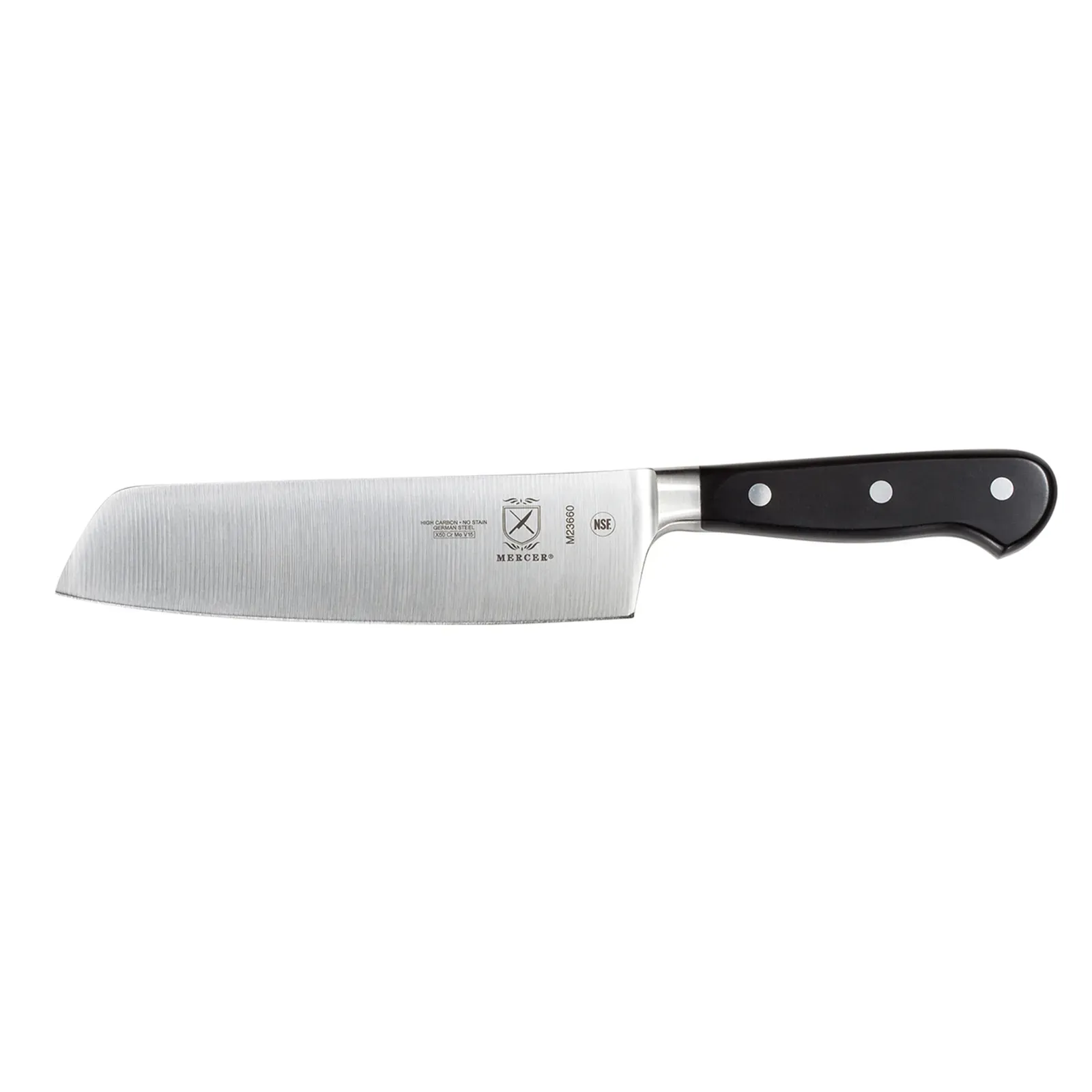Upgrade kitchen efficiency with the Mercer Culinary, M23660, Knife, Asian. This 7" Nakiri is a must-have tool for any commercial restaurant. Its one-piece precision forged construction and riveted design ensure durability and long-lasting performance. Made from high carbon, no-stain German steel, this knife delivers exceptional sharpness and edge retention, allowing for precise and effortless slicing, dicing, and chopping of vegetables and fruits. The ergonomic Delrin handle provides a comfortable grip, reducing hand fatigue during extended use. NSF certified, this knife meets the highest standards of safety and sanitation in a professional kitchen. Upgrade your culinary arsenal and experience the superior quality and performance of Mercer Culinary.