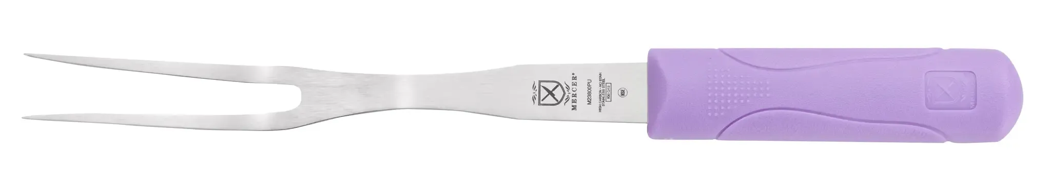 Maximize kitchen productivity with the Mercer Culinary, M23800PU, Cook's Fork. This high-quality tool is designed to meet the demands of a commercial restaurant setting, ensuring efficiency and precision in every use. The 8" blade and 13-1/2" overall length provide the perfect balance of control and maneuverability, allowing chefs to handle various cooking tasks with ease. Made from stamped, high carbon, stain-resistant steel, this fork is built to withstand the rigors of a busy kitchen while maintaining its sharpness and durability. The purple molded polypropylene handle not only adds a pop of color but also ensures a comfortable grip, reducing fatigue during extended use. With its NSF certification, this fork is suitable for allergen, HACCP, or dedicated use options, making it a versatile and reliable choice for any commercial kitchen.