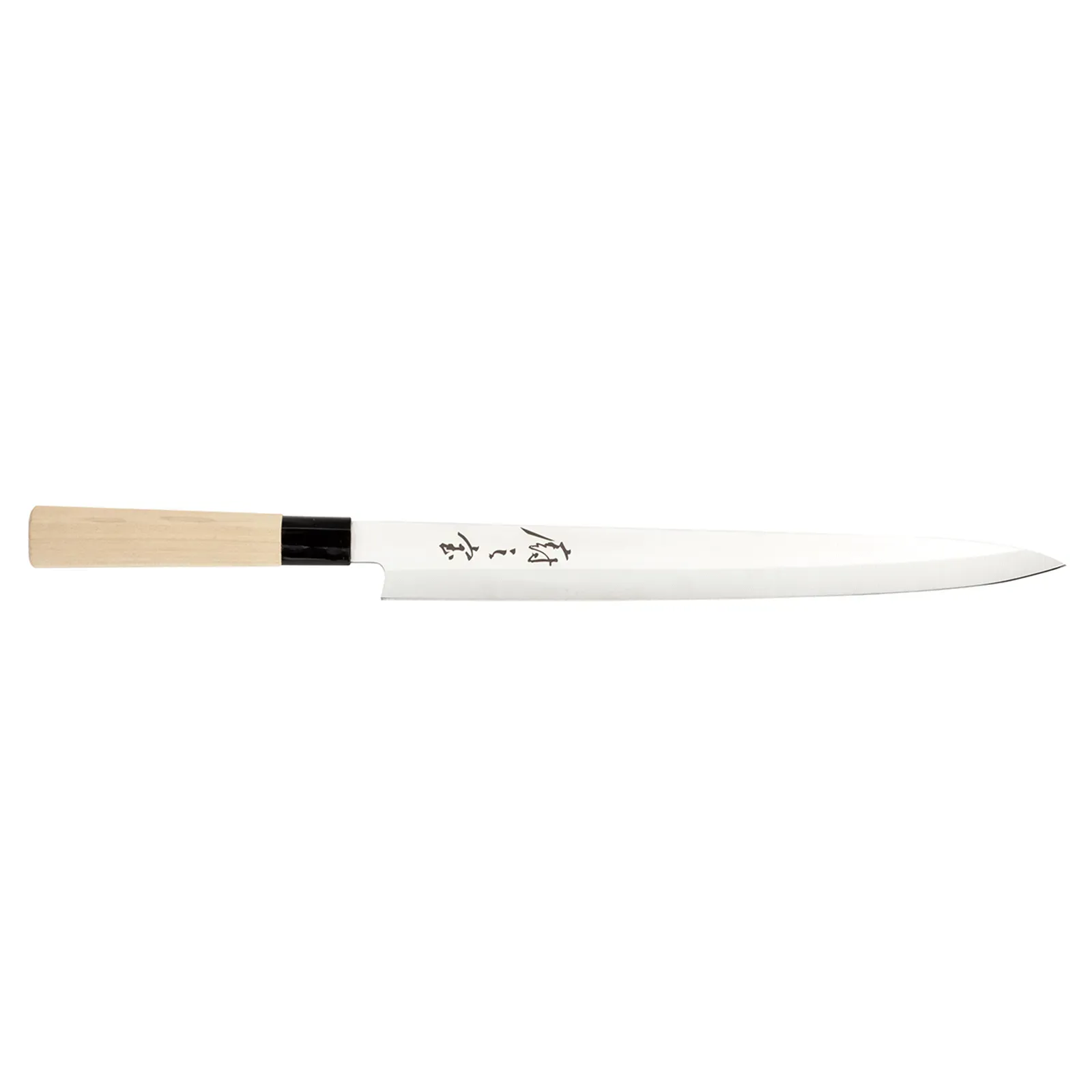Enhance culinary precision with the Mercer Culinary, M24012, Asian Knife. This 300 mm Sashimi knife is designed specifically for commercial restaurant use, making it an essential tool for any professional chef. The high carbon, stain-resistant German steel blade is stamped and features a single edge for precise slicing and cutting. With 6 one side and 15 other, this knife allows for versatile cutting techniques, ensuring you can create beautifully presented sashimi dishes with ease. The wood handle provides a comfortable grip, allowing for extended use without fatigue. Trust Mercer Culinary, a reputable vendor known for their quality kitchen tools, to deliver a knife that will enhance your culinary skills and elevate your restaurant's offerings.