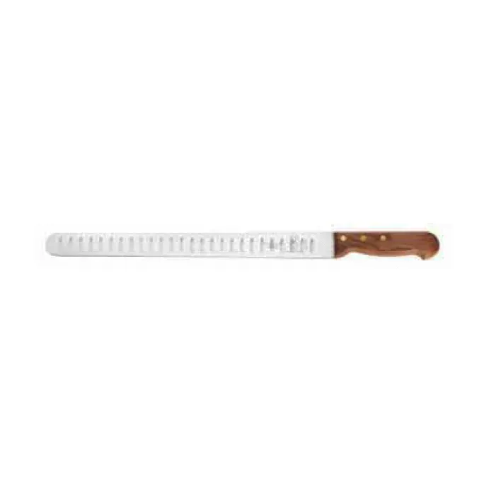 Equip your kitchen for success with the Mercer Culinary, M26080 Slicer Knife. This 14" slicer is designed to meet the demands of a commercial restaurant setting. The granton edge allows for smooth and precise slicing, ensuring consistent results every time. Made from high carbon Japanese stainless steel, this one-piece stamped knife is built to last and withstand the rigors of a busy kitchen. The rosewood handle provides a comfortable grip, reducing fatigue during extended use. With three compression brass rivets, this knife offers exceptional durability and stability. Whether you're slicing meats, cheeses, or vegetables, the Mercer Culinary, M26080 Slicer Knife is the perfect tool to enhance your kitchen's efficiency and deliver professional-quality results.