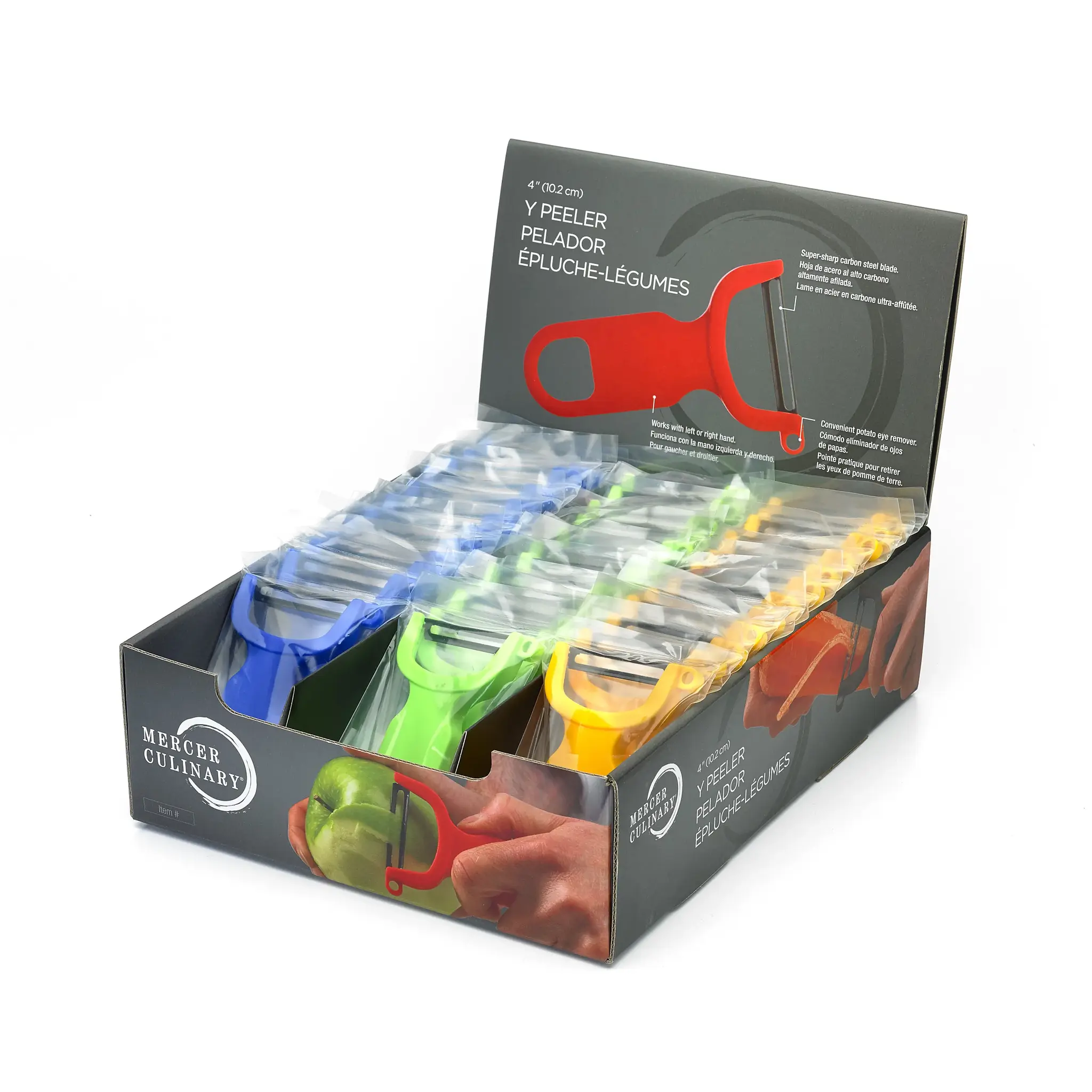 Maximize kitchen productivity with the Mercer Culinary, M33074, Vegetable Peeler. This manual peeler is a must-have tool for any commercial restaurant. With a 4" overall length and an ergonomic textured polypropylene handle, it offers a comfortable grip for extended use. The high-carbon steel blade ensures durability and sharpness, allowing for effortless peeling of fruits and vegetables. The integral potato eye remover makes it easy to remove imperfections, saving time and reducing waste. The peeler comes in a pack of 36, with 12 each of blue, green, and yellow, making it perfect for retail counter display. Hang it up using the convenient hanging hole when not in use. Trust Mercer Culinary, a reputable vendor in the industry, to provide you with a reliable and efficient vegetable peeler that will enhance your kitchen operations.