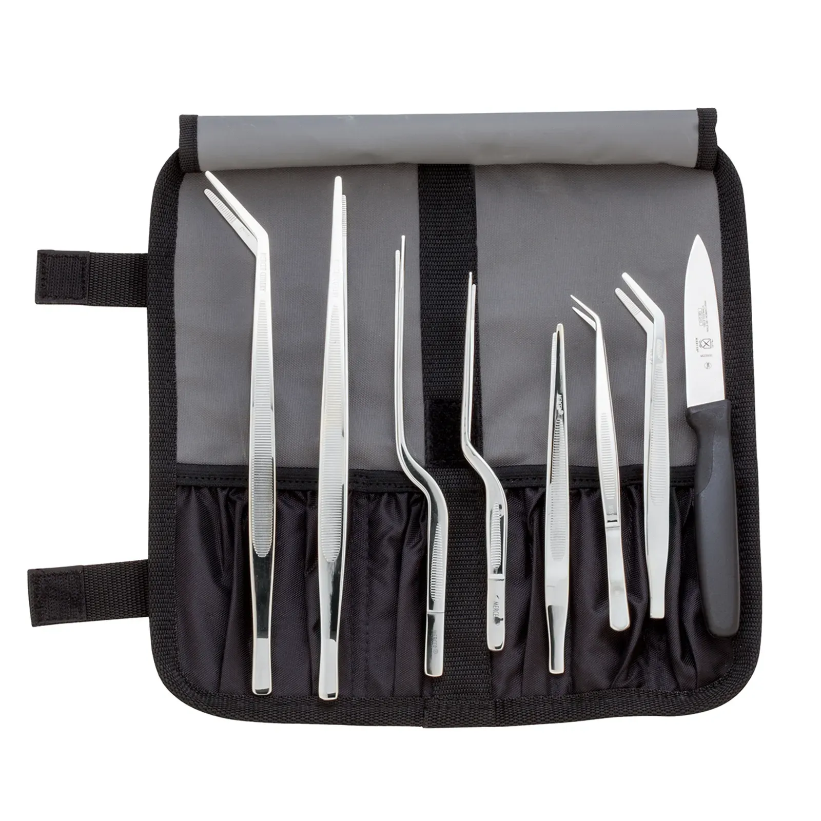 Maximize kitchen productivity with the Mercer Culinary, M35152, Plating Tool. This 10-piece set includes a variety of tongs and knives, perfect for precise plating in a commercial restaurant setting. The set features straight and curved tongs in different lengths, allowing for versatile plating techniques. The offset tongs provide added convenience and control, while the fine point curved tong is ideal for delicate garnishes. The set also includes a 3" black handle Millennia paring knife, complete with a knife guard for safety. To keep everything organized, the heavy-duty compartment roll ensures easy storage and transportation. Crafted by Mercer Culinary, a trusted name in the industry, this plating tool set is designed to withstand the demands of a busy kitchen. Elevate your culinary creations and impress your guests with the Mercer Culinary, M35152, Plating Tool.
