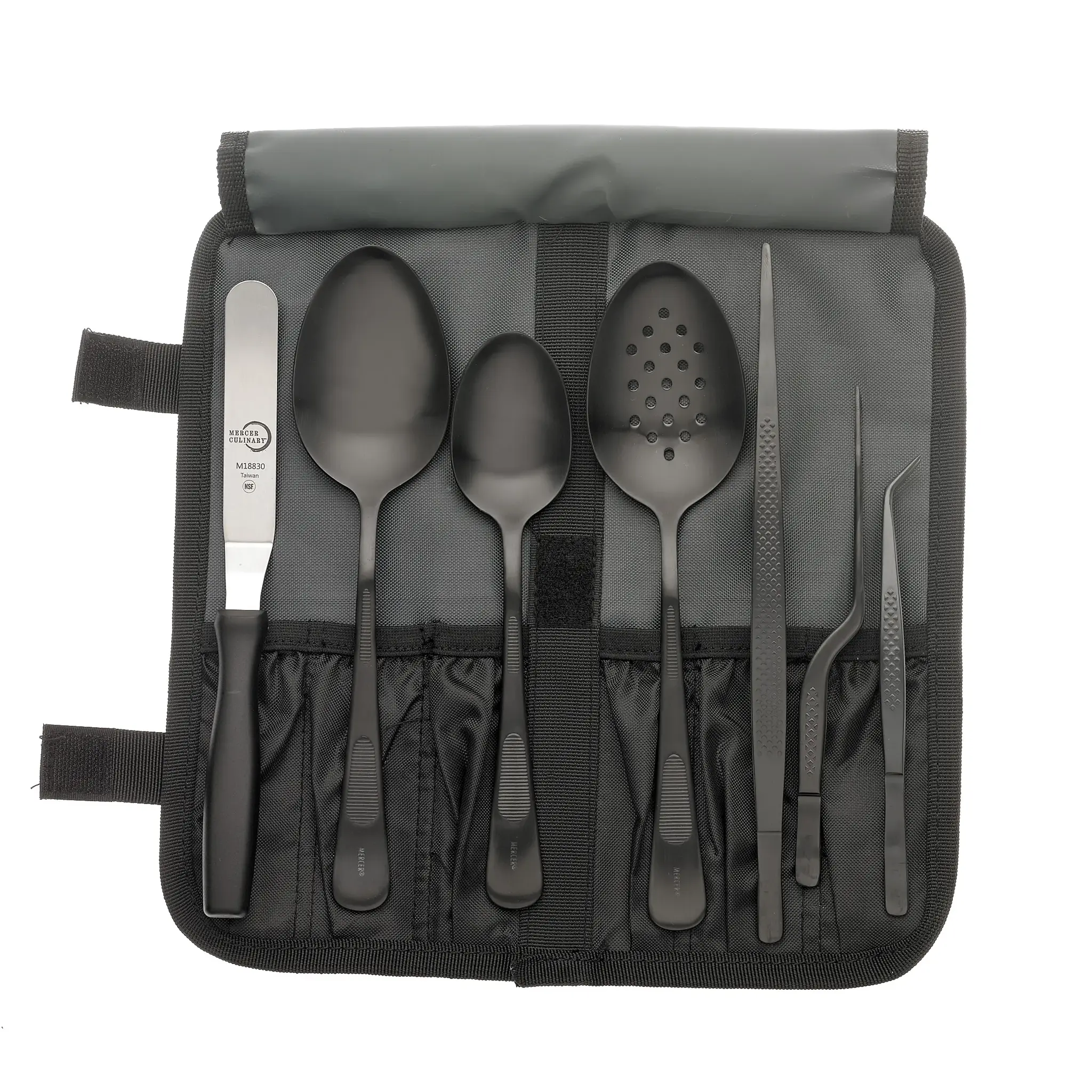 Upgrade culinary efficiency with the Mercer Culinary, M35156BK Plating Tool. This 8-piece set includes everything you need to create stunning and precise presentations in a commercial restaurant setting. The set features three solid plating spoons in varying sizes, allowing for precise placement of ingredients. The two plating tongs, one offset and one straight, provide a secure grip on delicate items for precise plating. The fine point curved tip plating tong is perfect for intricate designs and garnishes. The offset spatula is ideal for spreading and smoothing sauces and creams. All these tools come neatly organized in a heavy-duty 6-compartment tool roll bag, ensuring easy access and storage. With its matte black finish, this plating tool set adds a touch of sophistication to any kitchen. Elevate your culinary creations and impress your guests with the Mercer Culinary, M35156BK Plating Tool.