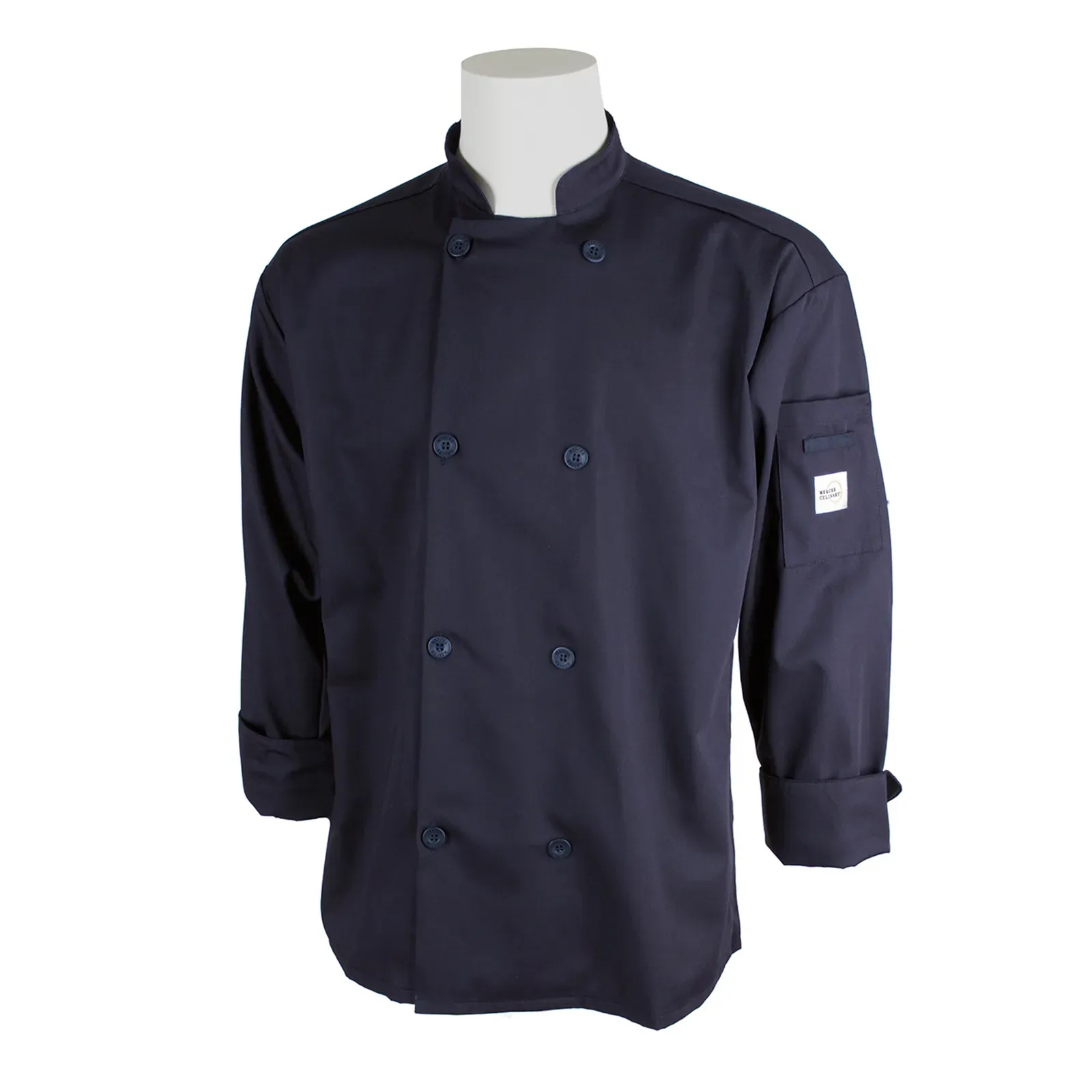 Elevate kitchen operations with the Mercer Culinary, M60010NB3X, Chef's Coat. This unisex jacket is designed to enhance the performance of chefs in commercial restaurant settings. Made with a durable 65/35 poly/cotton twill fabric, it ensures comfort and longevity, even during long shifts. The navy blue color adds a touch of professionalism to any culinary ensemble. With eight traditional buttons, this chef's coat offers a classic and timeless look. The shoulder pocket provides convenient storage for small essentials, allowing chefs to keep their tools within reach at all times. Trust Mercer Culinary, a reputable vendor in the industry, to deliver high-quality products that meet the demands of a busy restaurant environment. Upgrade your kitchen attire with the Mercer Culinary, M60010NB3X, Chef's Coat.