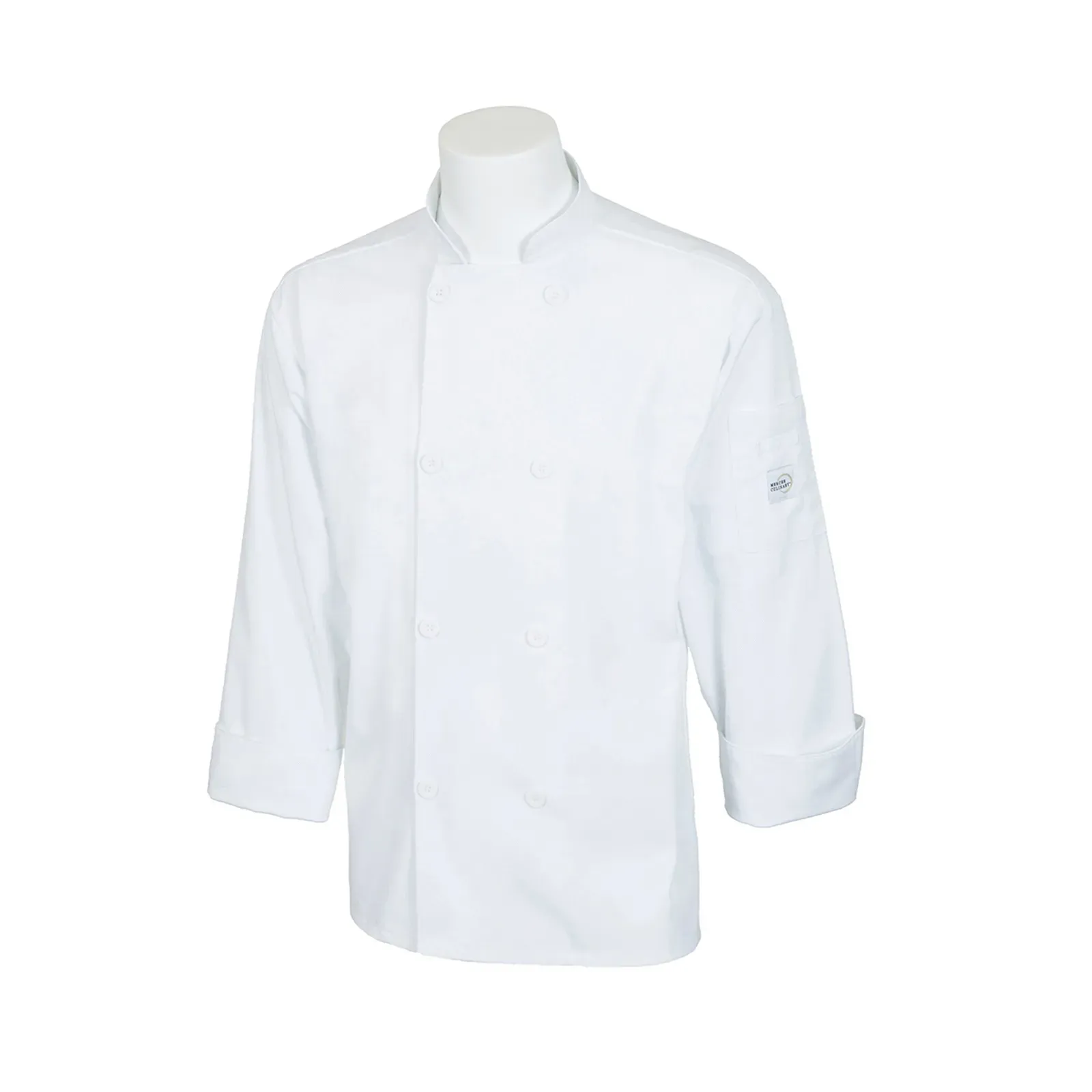 Maximize kitchen productivity with the Mercer Culinary, M60010WH8X Chef's Coat. This Millennia Unisex Jacket is designed to meet the demands of a busy commercial restaurant. With its 65/35 poly/cotton twill fabric, this coat offers durability and comfort, ensuring long-lasting performance in a fast-paced kitchen environment. The eight traditional buttons provide a classic and professional look, while the shoulder pocket adds convenience for storing essential tools. Whether you're a chef, line cook, or kitchen staff, this chef's coat is a must-have for maintaining a polished appearance while working efficiently. Trust Mercer Culinary, a reputable vendor in the culinary industry, to deliver high-quality products that enhance your restaurant's image and functionality. Elevate your kitchen attire with the Mercer Culinary, M60010WH8X Chef's Coat.