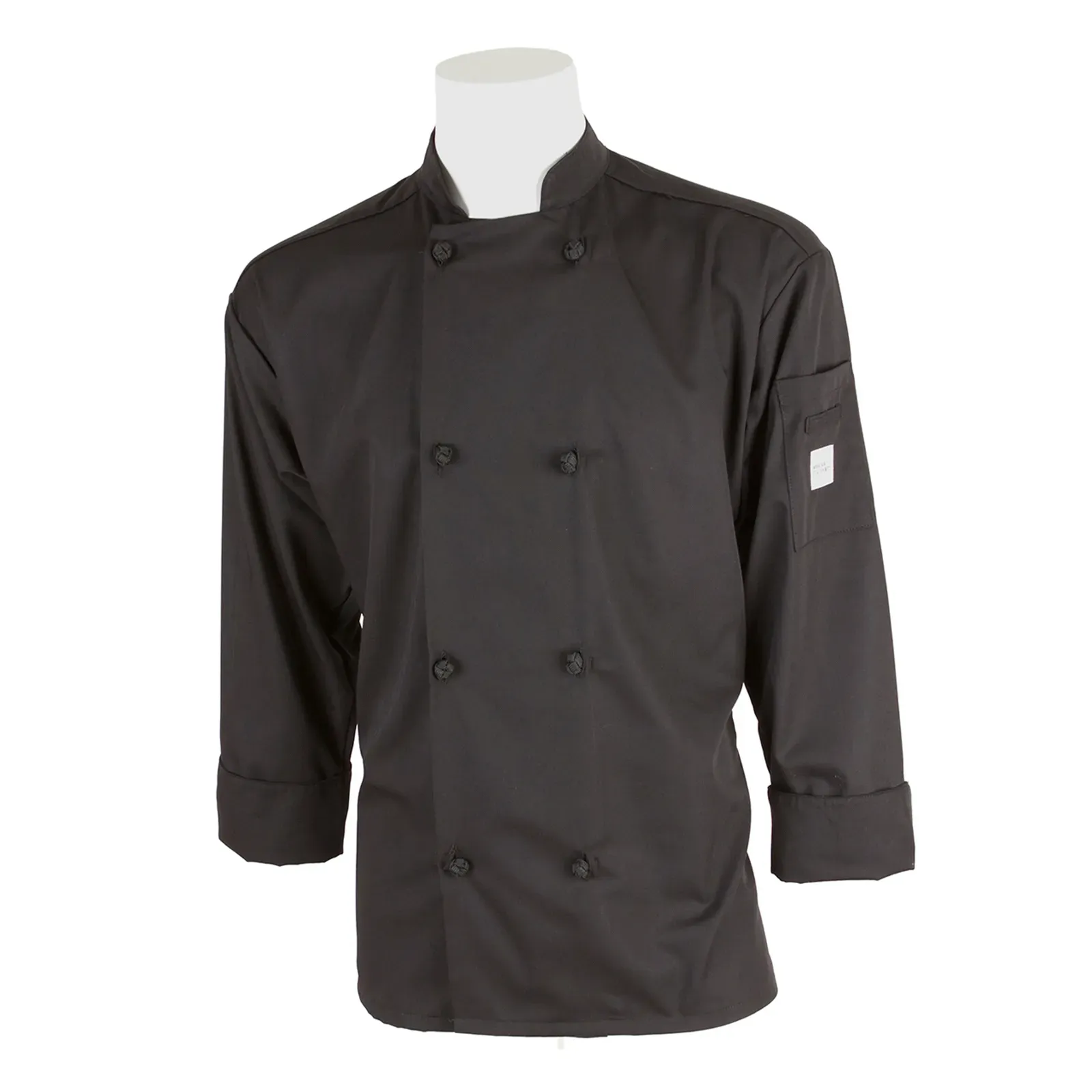 Optimize kitchen workflow with the Mercer Culinary, M60012BK1X Chef's Coat. This Millennia Unisex Jacket is designed to enhance efficiency and comfort in a commercial restaurant setting. With its eight cloth knot buttons, this coat offers a secure and professional fit, ensuring that chefs can focus on their culinary creations without any distractions. The shoulder pocket provides a convenient storage solution for essential tools, allowing chefs to have quick access to their utensils while keeping their hands free. Made from a durable 65/35 poly/cotton twill fabric, this black chef's coat is both stylish and practical, offering easy maintenance and long-lasting performance. Elevate your restaurant's image and provide your chefs with the comfort and functionality they need with the Mercer Culinary, M60012BK1X Chef's Coat.