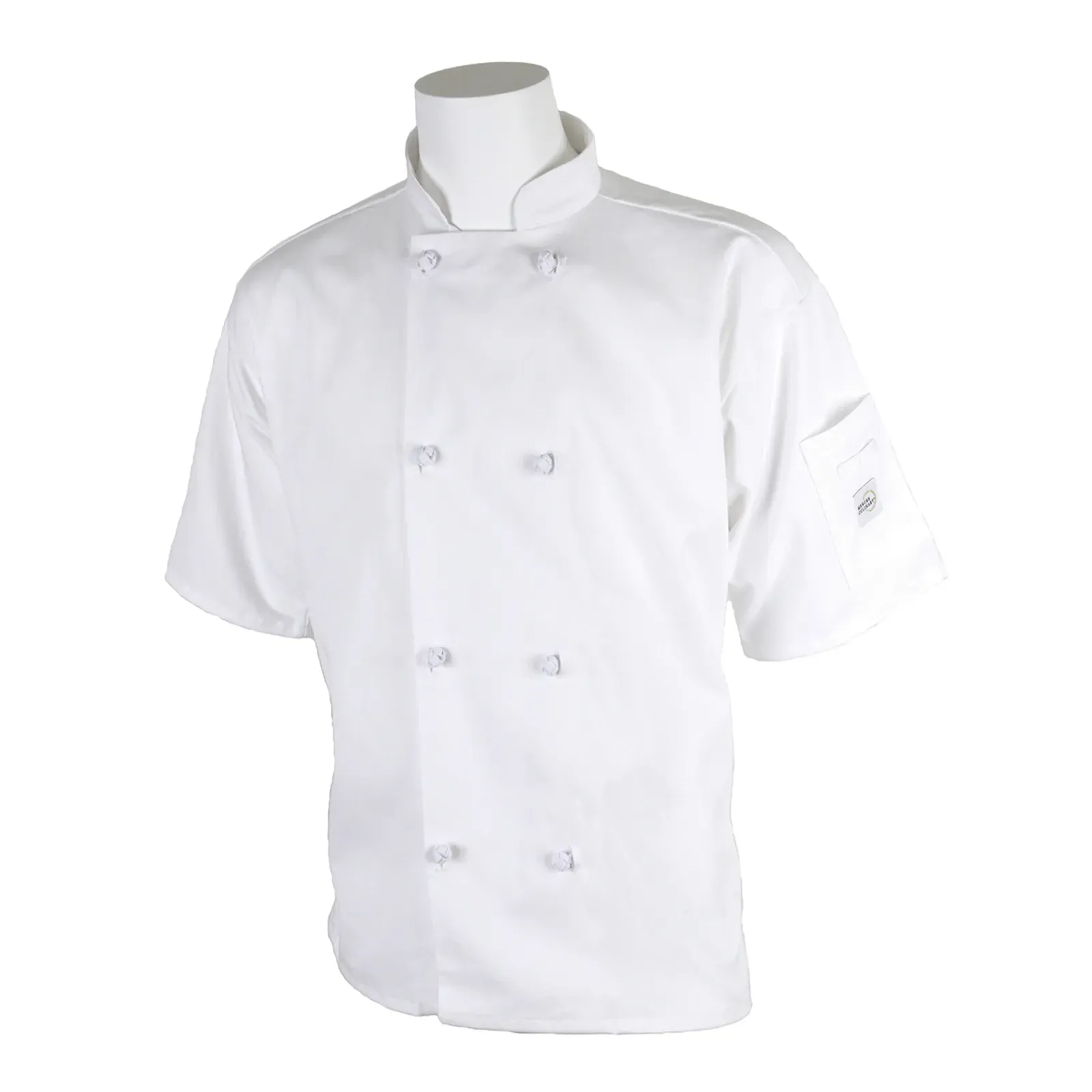 Upgrade culinary efficiency with the Mercer Culinary, M60014WHL Chef's Coat. This Millennia Unisex Jacket is designed for commercial restaurant use, offering both style and functionality. The short sleeves provide comfort and freedom of movement, while the eight cloth knot buttons add a touch of sophistication. The shoulder pocket allows for easy access to essential tools, ensuring efficiency in a fast-paced kitchen environment. Made from a durable 65/35 poly/cotton twill fabric, this white chef's coat is both comfortable and easy to clean, making it perfect for long hours in the kitchen. Trust Mercer Culinary for high-quality, professional-grade chef's apparel that enhances performance and style in any commercial kitchen.