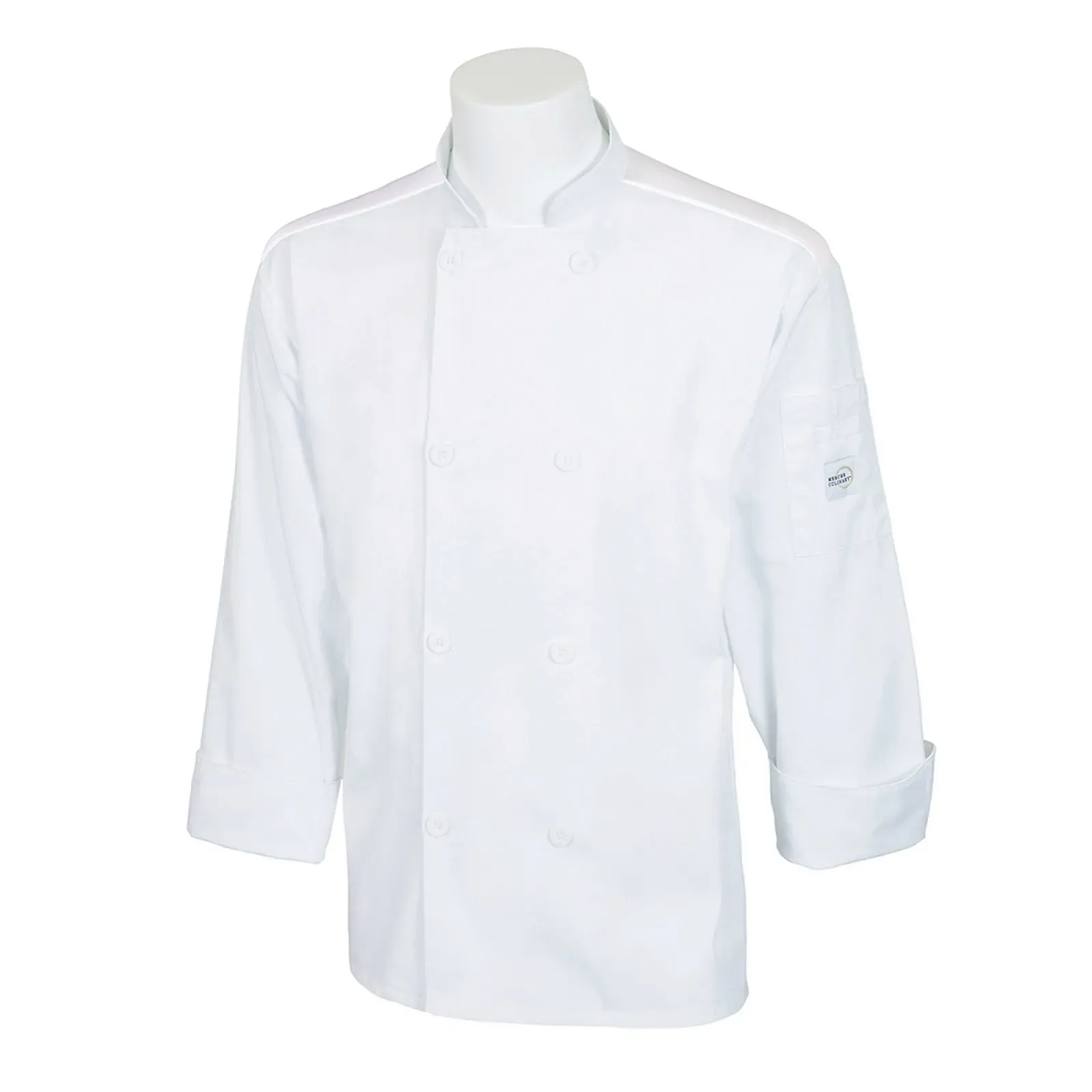 Upgrade culinary efficiency with the Mercer Culinary, M60017WHL Chef's Coat. This unisex jacket is designed to enhance comfort and functionality in a commercial restaurant setting. The full mesh back ensures breathability, keeping chefs cool and comfortable during long shifts. With eight traditional buttons, this chef's coat offers a classic and professional look. The shoulder pocket provides convenient storage for small tools or pens, allowing chefs to keep essential items within reach at all times. Made from a durable 65/35 poly/cotton twill fabric, this white chef's coat is both stylish and easy to clean. Trust Mercer Culinary, a reputable vendor in the industry, to deliver high-quality chef's coats that meet the demands of a busy restaurant kitchen.