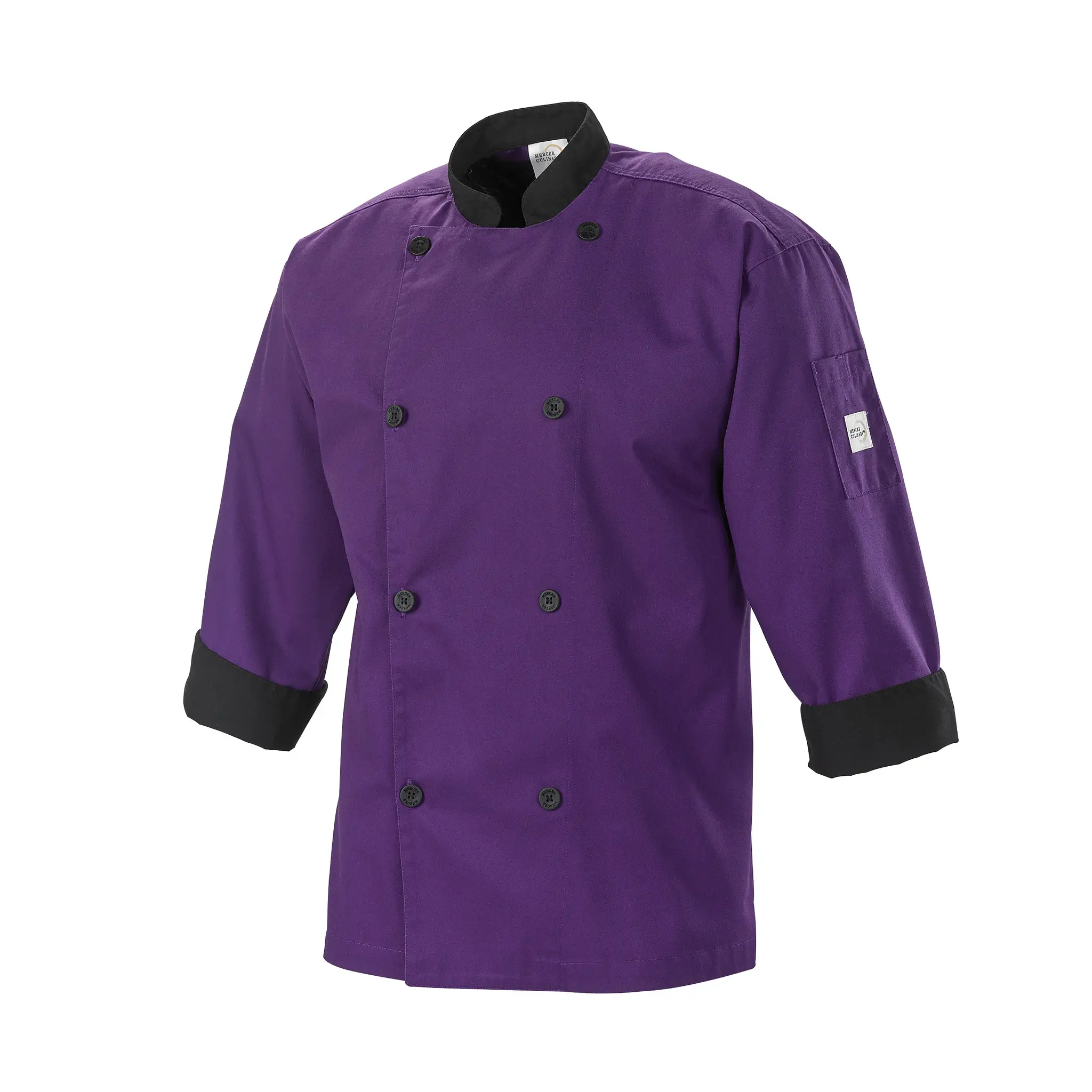 Equip your kitchen for success with the Mercer Culinary, M60018PUB2X Chef's Coat. This unisex jacket is designed to meet the demands of a commercial restaurant setting, ensuring both style and functionality. Made from a durable 65/35 poly/cotton twill fabric, this 3/4 sleeve coat offers comfort and breathability, allowing your staff to work efficiently in a fast-paced environment. The coat features eight traditional buttons for a professional look, while the purple color with black accents adds a touch of sophistication. With a shoulder pocket, your chefs can conveniently store small tools or pens, keeping them within reach at all times. Trust Mercer Culinary for high-quality, reliable chef's coats that will elevate your restaurant's image and performance.