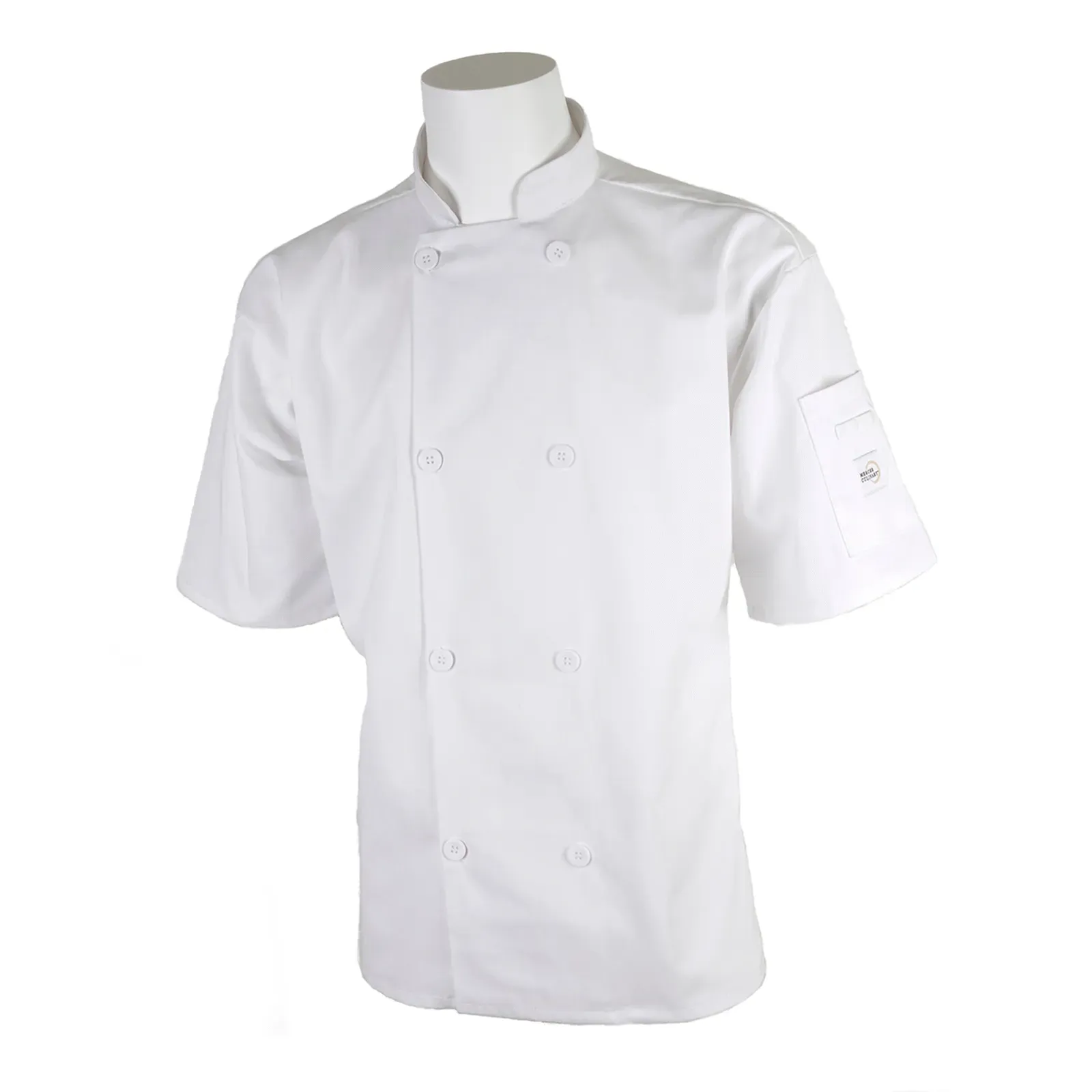 Upgrade culinary efficiency with the Mercer Culinary, M60019WHXS Chef's Coat. This unisex jacket is designed to enhance comfort and functionality in a commercial restaurant setting. Made with a 65/35 poly/cotton twill fabric, it offers durability and easy maintenance. The short sleeves and full mesh back provide breathability, keeping chefs cool during long shifts. With eight traditional buttons, this chef's coat exudes a professional look while ensuring a secure fit. The shoulder pocket adds convenience, allowing chefs to keep essential tools within reach. Whether you're running a bustling restaurant or a busy catering service, the Mercer Culinary Chef's Coat is a must-have for any commercial kitchen. Elevate your culinary experience with this high-quality, functional, and stylish chef's coat.