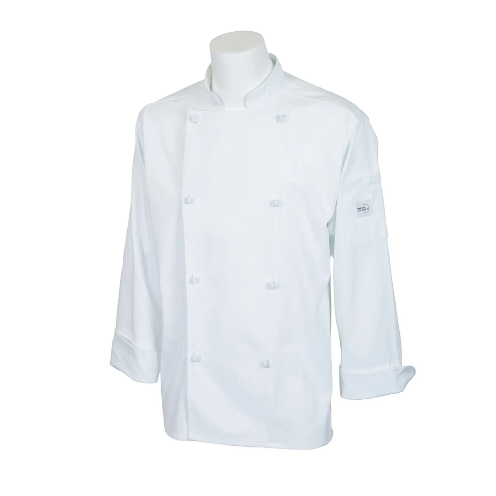 Maximize kitchen productivity with the Mercer Culinary, M61020WH2X, Chef's Coat. This unisex chef jacket is designed to enhance performance and comfort in a commercial restaurant setting. With its 60/40 cotton/poly blend, this coat offers durability and breathability, ensuring that chefs stay cool and comfortable during long shifts. The eight cloth knot buttons provide a secure closure, while the utility shoulder pocket offers convenient storage for essential tools. The side slits allow for ease of movement, allowing chefs to work efficiently in the kitchen. Whether you're a professional chef or a restaurant owner, the Mercer Culinary, M61020WH2X, Chef's Coat is a must-have for a stylish and functional uniform that will withstand the demands of a busy kitchen.