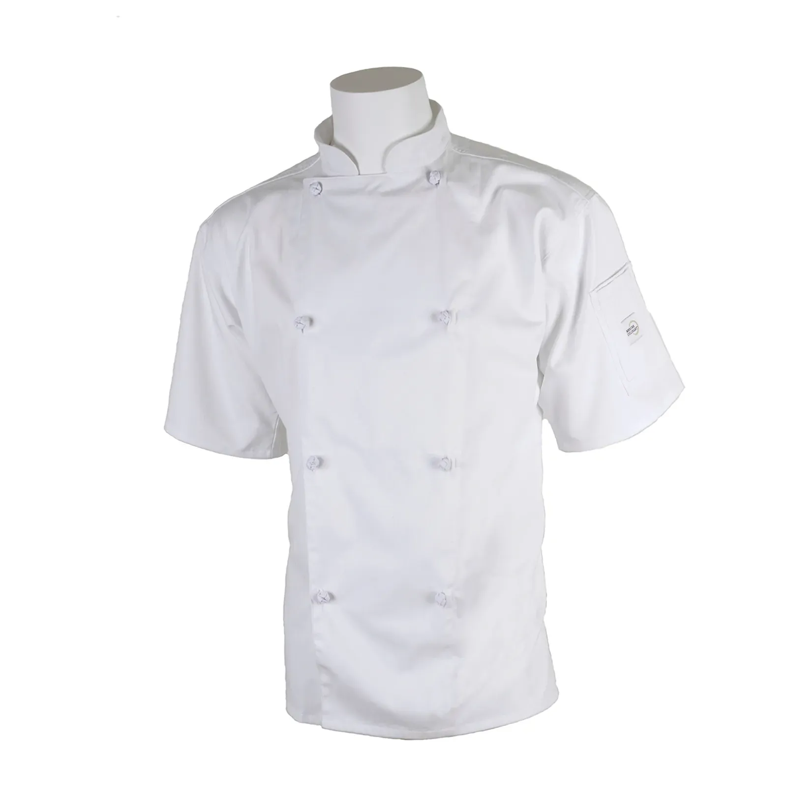 Upgrade culinary efficiency with the Mercer Culinary, M61022WHL, Chef's Coat. This Genesis Unisex Chef Jacket is designed for optimal performance in a commercial restaurant setting. With its short sleeves and eight cloth knot buttons, this chef's coat offers both comfort and style. The utility shoulder pocket provides convenient storage for essential tools, while the side slits allow for ease of movement during busy shifts. Made from a durable blend of 60/40 cotton/poly, this white chef's coat is both breathable and easy to clean. The large size ensures a comfortable fit for most chefs. Elevate your restaurant's professional image and provide your chefs with the quality they deserve with the Mercer Culinary, M61022WHL, Chef's Coat.