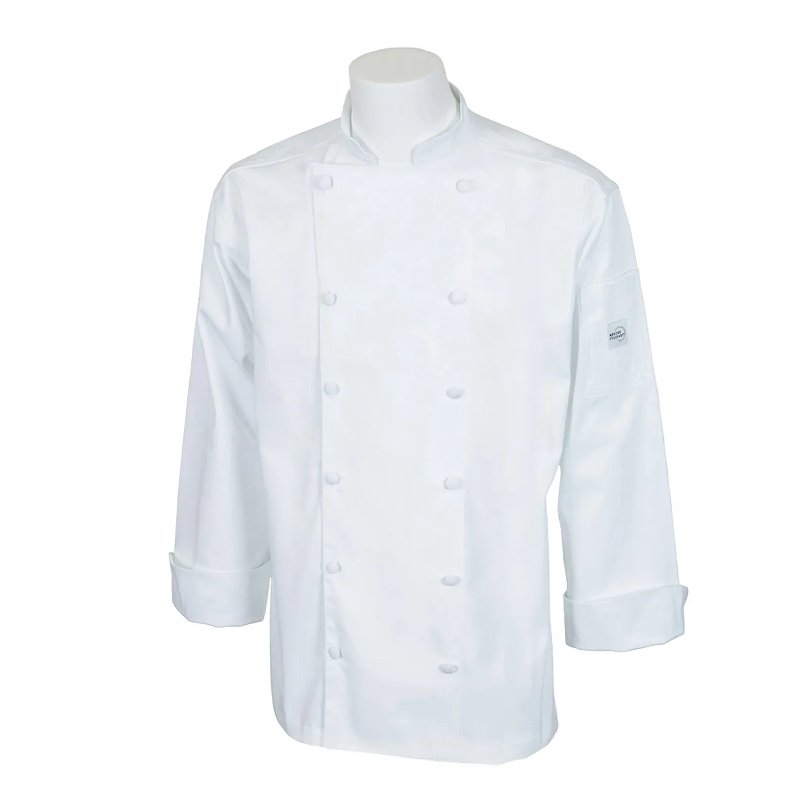Maximize kitchen productivity with the Mercer Culinary, M62030WH2X, Chef's Coat. This Renaissance Mens Jacket is designed for commercial restaurant use, ensuring both style and functionality. The traditional neck and cloth covered buttons give it a classic and professional look, while the utility shoulder pocket provides convenient storage for essential tools. The ear bud opening allows for easy access to music or communication devices, keeping you connected and focused on the task at hand. Made from a durable blend of 60/40 cotton/poly, this white chef's coat is both comfortable and easy to clean. Trust Mercer Culinary for all your chef apparel needs and elevate your restaurant's image with this exceptional chef's coat.