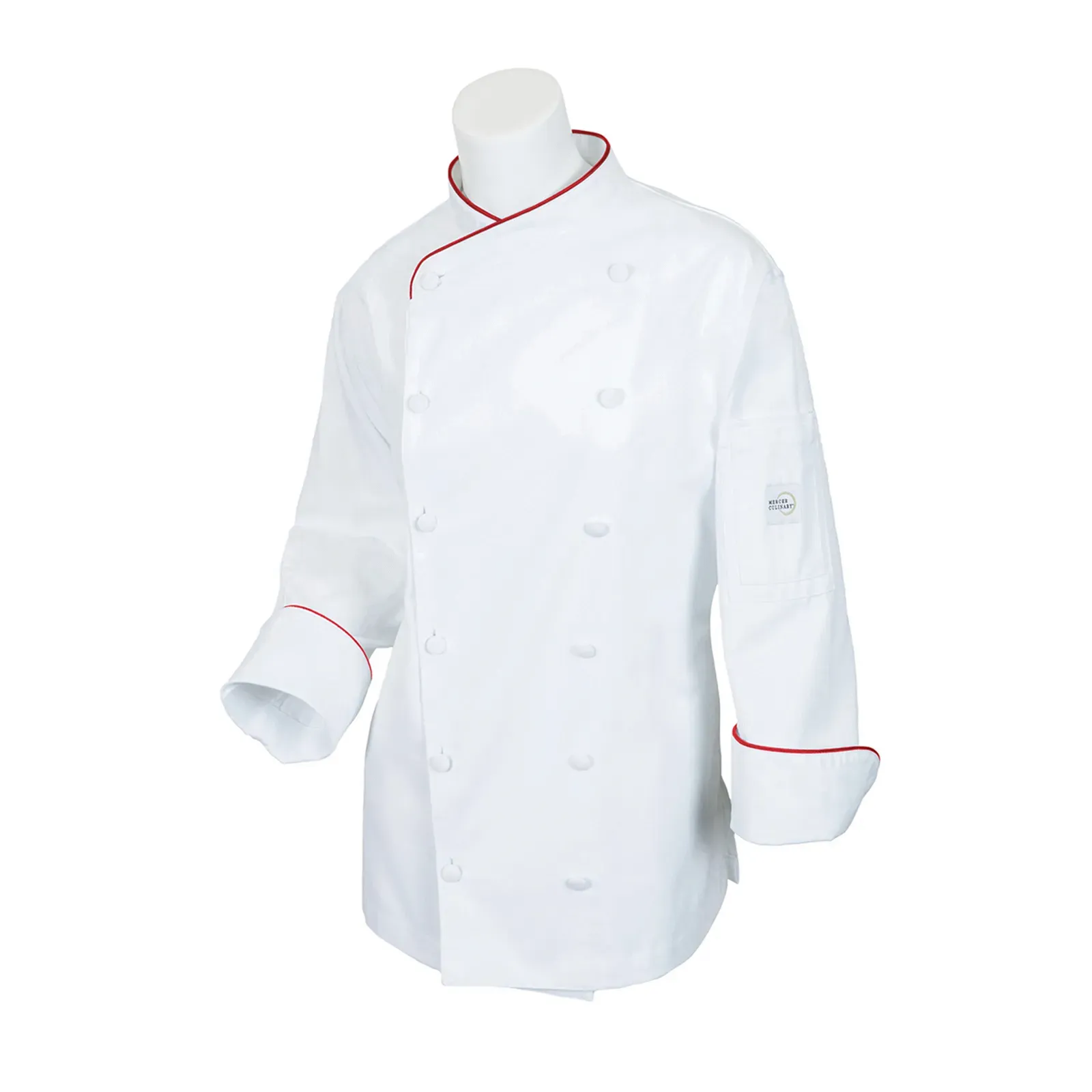 Equip your kitchen for success with the Mercer Culinary, M62045WRM Chef's Coat. This Renaissance Women's Jacket is designed to meet the demands of a commercial restaurant setting. Made with a blend of 60% cotton and 40% polyester, this coat offers both comfort and durability. The scoop neck and 12 cloth-covered buttons add a touch of elegance, while the white color with red piping on the neck and cuffs adds a stylish flair. The utility shoulder pocket provides convenient storage for essential tools, and the ear bud opening allows for easy access to personal devices. With side slits for ease of movement, this chef's coat ensures comfort during long hours in the kitchen. Trust Mercer Culinary for high-quality, professional-grade chef's coats that deliver both style and functionality.