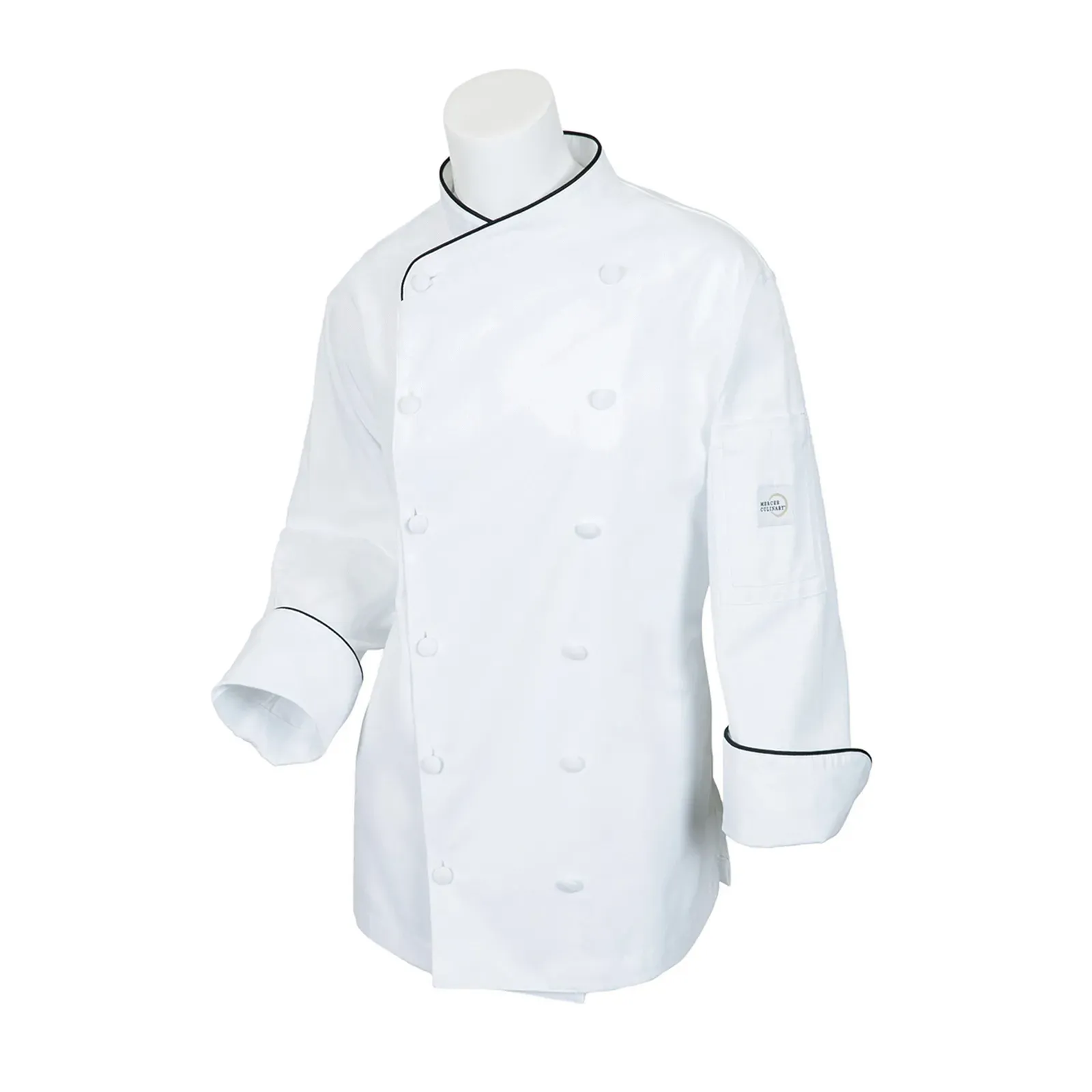 Upgrade culinary efficiency with the Mercer Culinary, M62050WBL Chef's Coat. This Renaissance Women's Jacket is designed to enhance your performance in the kitchen. Made with a blend of 60% cotton and 40% polyester, this coat offers both comfort and durability. The scoop neck and cloth covered buttons add a touch of elegance, while the utility shoulder pocket provides convenient storage for essential tools. The ear bud opening allows you to stay connected while working, and the side slits ensure ease of movement. With its white color and black piping on the neck and cuffs, this coat exudes professionalism. Elevate your restaurant's image and provide your staff with the quality they deserve with the Mercer Culinary Chef's Coat.