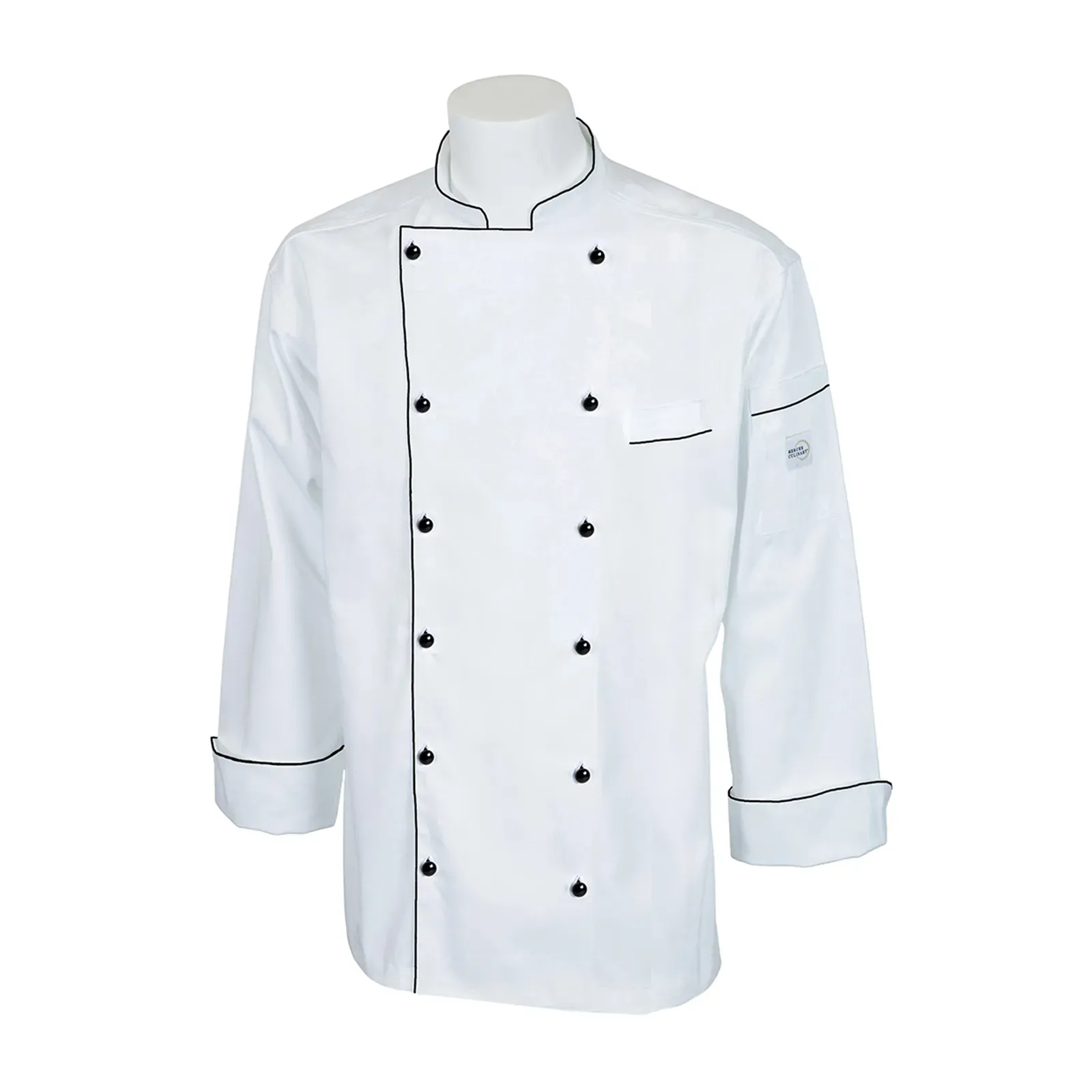 Enhance culinary precision with the Mercer Culinary, M62090WBS Chef's Coat. This Renaissance Men's Jacket is designed for commercial restaurant use, ensuring both style and functionality. Made with a 60/40 cotton/poly blend, this coat offers comfort and durability for long hours in the kitchen. The traditional neck and push-through black buttons add a touch of elegance, while the utility shoulder pocket and chest welt pocket provide convenient storage for essential tools. The white coat with full black piping exudes professionalism, making it perfect for chefs and kitchen staff. Trust Mercer Culinary, a reputable vendor in the industry, to deliver high-quality products that meet the demands of a busy restaurant kitchen. Elevate your culinary experience with the Mercer Culinary, M62090WBS Chef's Coat.