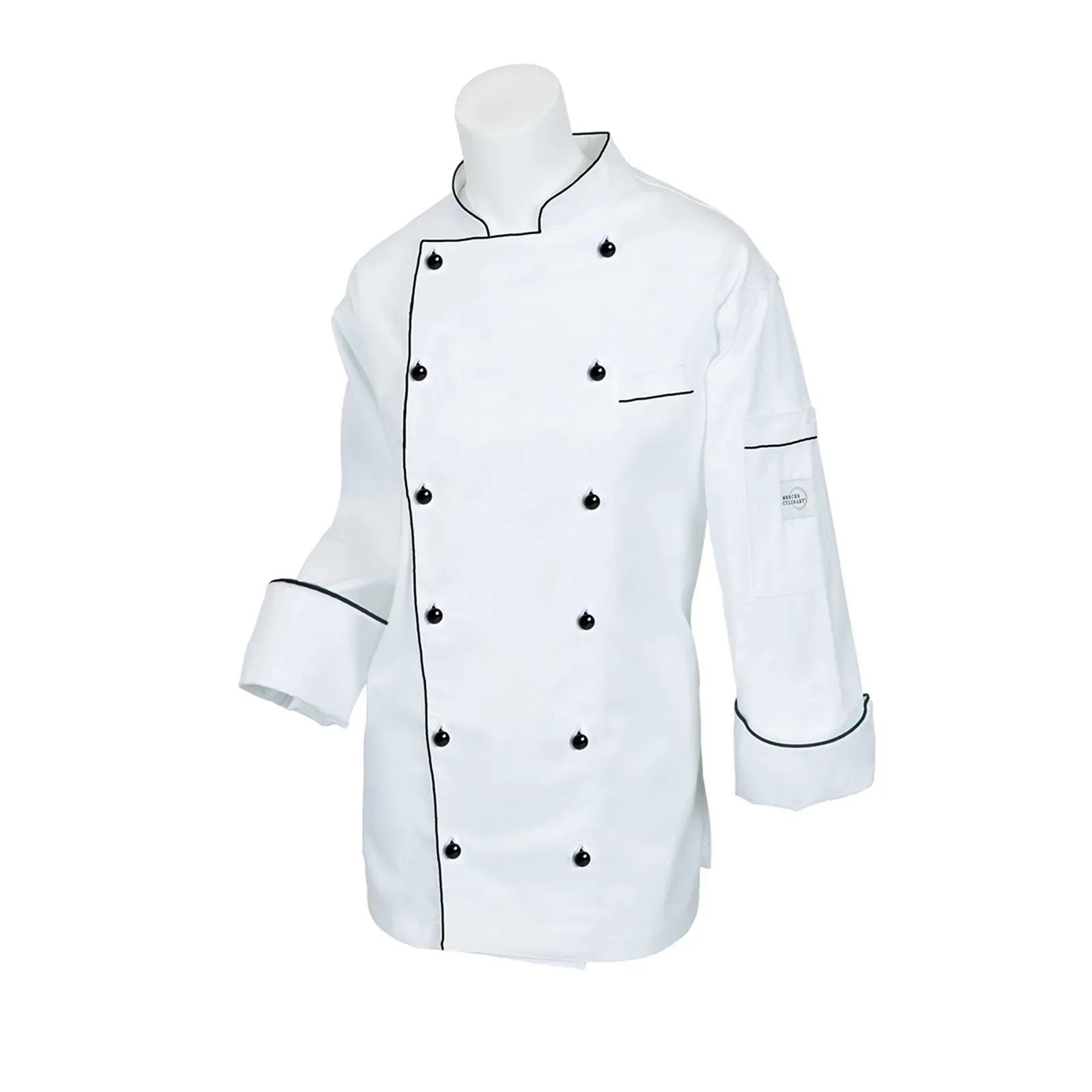 Upgrade culinary efficiency with the Mercer Culinary, M62095WB3X Chef's Coat. This Renaissance Women's Jacket is designed for commercial restaurant use, offering both style and functionality. Made with a 60/40 cotton/poly blend, this coat provides comfort and durability for long hours in the kitchen. The traditional neck and 12 push-through black buttons add a touch of elegance, while the shoulder pocket and chest welt pocket offer convenient storage for essential tools. The side slits ensure ease of movement, allowing you to work with agility and precision. With a white color and full black piping, this chef's coat exudes professionalism and sophistication. Elevate your restaurant's image and outfit your staff in the Mercer Culinary, M62095WB3X Chef's Coat.