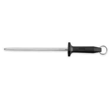 Boost culinary performance effectively with the Mundial, 3306-10, Knife Sharpening Steel. This premium sharpening steel is a must-have tool for any commercial restaurant. With its 10-inch round/regular cut, it is perfect for maintaining the sharpness and precision of your knives, ensuring smooth and effortless cutting every time. The black poly handle with a hanging ring provides a comfortable grip and easy storage, allowing for quick access whenever you need it. NSF certified, this sharpening steel meets the highest standards of safety and hygiene in a professional kitchen. Trust Mundial, a trusted name in the industry, to enhance your culinary experience and elevate your restaurant's performance.