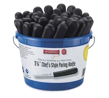 Streamline Food Preparation Dynamics with the Mundial, 5601BKT, Knife, Paring. This chef's style paring knife is a must-have tool for any commercial restaurant. With a 3-1/4" blade, it is perfect for precision cutting, peeling, and trimming tasks. The knife is packed in a 48-piece bucket, making it convenient for busy kitchens. The black handle adds a sleek and professional touch to the knife, while the high-quality stainless steel blade ensures durability and long-lasting performance. Designed by Mundial, a trusted name in the industry, this paring knife is built to withstand the demands of a commercial kitchen. Whether you're a professional chef or a restaurant owner, this knife will help you achieve efficient and precise food preparation. Invest in the Mundial, 5601BKT, Knife, Paring and experience the difference it makes in your restaurant's kitchen.
