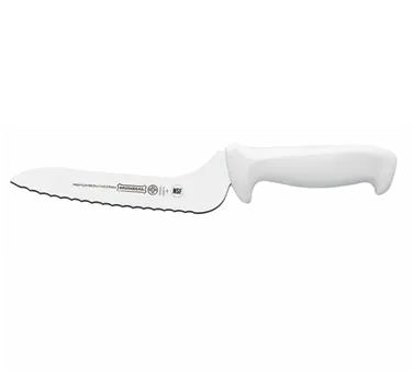 Boost kitchen efficiency with the Mundial W5620-7E Knife, Bread / Sandwich. This high-quality knife is designed to meet the demands of a commercial restaurant setting. With its serrated edge and offset design, it effortlessly slices through bread and sandwiches, ensuring consistent and precise cuts every time. The high carbon/no stain blade retains its sharpness and durability, even with frequent use. The molded white polypropylene handle provides a comfortable grip, allowing for extended use without discomfort. Additionally, the handle is treated with sanitized antimicrobial protection, ensuring a hygienic and safe food preparation environment. The knife is NSF certified, guaranteeing its quality and suitability for commercial use. Upgrade your restaurant's knife collection with the Mundial W5620-7E Knife, Bread / Sandwich and experience improved efficiency and performance.