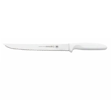 Elevate Kitchen Mastery Experience with the Mundial W5622-8E Utility Knife. This versatile knife is a must-have for any commercial restaurant. With its 8" serrated edge, high carbon/no stain blade, and molded white polypropylene handle, this knife offers exceptional durability and precision. The blade is treated with sanitized antimicrobial protection, ensuring a hygienic cutting experience. Whether you're slicing through meats, bread, or delicate fruits and vegetables, this utility knife delivers clean and effortless cuts every time. The NSF certification guarantees its quality and safety for professional use. Enhance your culinary skills and streamline your food preparation process with the Mundial W5622-8E Utility Knife.