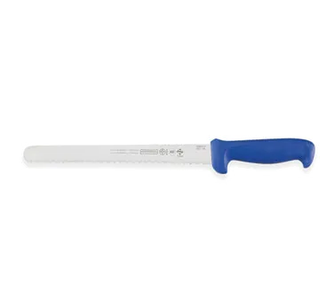 Boost Culinary Performance Effectively with the Mundial B5627-10E Slicer Knife. This high-quality knife is designed to meet the demands of a commercial restaurant setting. With its serrated edge and 10" blade, it effortlessly slices through a variety of ingredients, making it perfect for slicing meats, bread, and more. The 1-1/8" wide handle provides a comfortable grip, allowing for precise control and reducing fatigue during extended use. The blade is made from high carbon steel, ensuring durability and resistance to staining. The molded blue polypropylene handle is treated with sanitized antimicrobial protection, keeping it clean and safe for use. With its NSF certification, this knife meets the highest standards of quality and safety. Upgrade your culinary arsenal with the Mundial B5627-10E Slicer Knife and experience enhanced efficiency and precision in your restaurant.