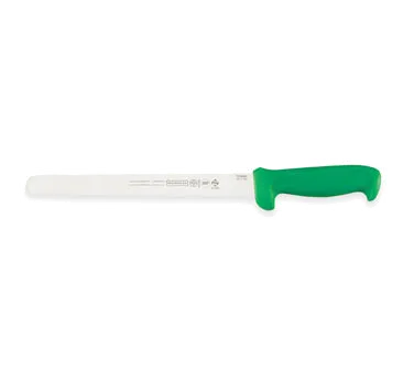 Enhance Culinary Precision Seamlessly with the Mundial G5627-10E Slicer Knife. Designed specifically for commercial restaurant use, this knife is a must-have tool for any professional chef. The 10" serrated edge allows for effortless slicing of meats, breads, and more, ensuring consistent and precise cuts every time. The blade is made from high carbon/no stain steel, guaranteeing durability and resistance to corrosion. The molded green polypropylene handle provides a comfortable grip, allowing for extended use without discomfort. Additionally, the handle is treated with sanitized antimicrobial protection, ensuring a hygienic and safe cooking environment. With its NSF certification, this knife meets the highest standards of quality and safety. Elevate your culinary skills and efficiency with the Mundial G5627-10E Slicer Knife.