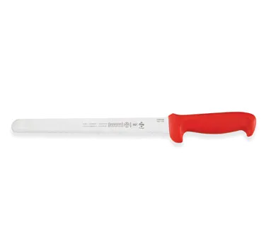 Boost Kitchen Efficiency Seamlessly with the Mundial R5627-10E Slicer Knife. This high-quality knife is designed to meet the demands of a commercial restaurant setting. With its serrated edge and 10" blade, it effortlessly slices through a variety of ingredients, saving you time and effort. The 1-1/8" wide handle provides a comfortable grip, allowing for precise control and reducing the risk of accidents. The blade is made from high carbon steel, ensuring durability and resistance to staining. The molded red polypropylene handle is treated with sanitized antimicrobial protection, promoting a hygienic environment in your kitchen. The knife comes in a pack of 6, making it a cost-effective choice for busy restaurants. Trust Mundial, a reputable vendor known for their quality kitchen tools, to deliver a reliable and efficient slicing solution.