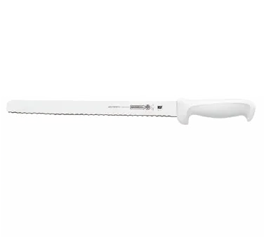 Boost Kitchen Efficiency Seamlessly with the Mundial W5627-12E Slicer Knife. This high-quality knife is designed to meet the demands of a commercial restaurant setting. With its 12" serrated edge and 1-1/8" wide handle, it effortlessly slices through a variety of ingredients, saving you time and effort. The blade is made from high carbon/no stain steel, ensuring long-lasting durability and resistance to corrosion. The molded white polypropylene handle provides a comfortable grip, allowing for precise control and reducing the risk of accidents. Additionally, the handle is treated with sanitized antimicrobial protection, promoting a hygienic environment in your kitchen. The Mundial W5627-12E Slicer Knife is NSF certified, guaranteeing its quality and safety. Whether you're slicing meats, bread, or vegetables, this knife is a must-have tool for any professional chef or restaurant owner.