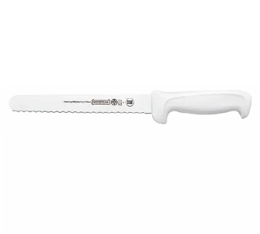 Streamline Culinary Workflow Effectively with the Mundial W5627-8E Slicer Knife. This high-quality knife is designed to meet the demands of a busy commercial restaurant kitchen. With its 8" serrated edge, it effortlessly slices through meats, bread, and other ingredients, saving you time and effort. The blade is made from high carbon steel, ensuring durability and resistance to staining. The molded white polypropylene handle provides a comfortable grip, allowing for precise control and reducing the risk of accidents. Additionally, the handle is treated with sanitized antimicrobial protection, keeping the knife hygienic and safe to use. The Mundial W5627-8E Slicer Knife is NSF certified, guaranteeing its quality and suitability for commercial use. Enhance your kitchen's efficiency and productivity with this reliable and versatile slicer knife.