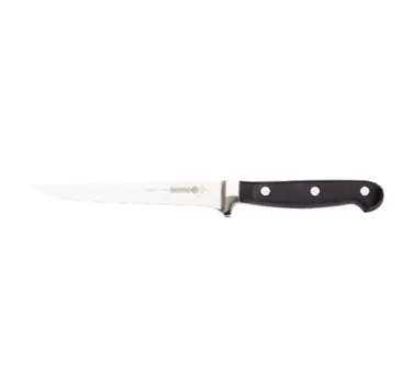 Streamline Culinary Workflow Effectively with the Mundial BP5114-6 Boning Knife. This fully forged high carbon/no stain blade is designed to meet the demands of a busy commercial restaurant kitchen. The 6" straight edge allows for precise cuts, making it ideal for deboning meats and poultry. The black polyacetal handle provides a comfortable grip, ensuring control and reducing fatigue during extended use. NSF certified, this knife meets the highest standards of safety and sanitation. Whether you're a chef, butcher, or caterer, this boning knife is a must-have for effortlessly preparing a wide range of dishes. Invest in quality and experience the difference with Mundial.