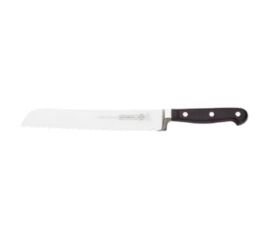 Streamline Culinary Workflow Effectively with the Mundial BP5121-8E Knife, Bread / Sandwich. This fully forged high carbon/no stain blade is designed to effortlessly slice through bread, making it a must-have tool for any commercial restaurant. The serrated edge ensures clean and precise cuts, while the black polyacetal handle provides a comfortable grip for extended use. The NSF certification guarantees the knife's quality and safety, giving you peace of mind in a fast-paced restaurant environment. Packaged in a sleek gift box, the Mundial BP5121-8E Knife combines functionality and style, making it an excellent addition to any professional kitchen. Upgrade your culinary arsenal and enhance your restaurant's efficiency with this top-of-the-line bread slicer.