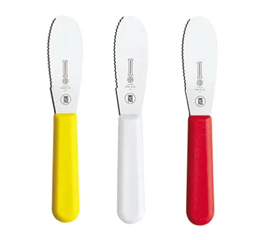 Master Culinary Tasks with Mundial's SCRYW5688E-3 Sandwich Spreader. This versatile tool is a must-have for any commercial restaurant. With its serrated edge and stainless steel blade, it effortlessly spreads condiments, making it perfect for sandwiches, burgers, and more. The molded polypropylene handle provides a comfortable grip, ensuring precision and control while spreading. Mundial has treated the handle with sanitized antimicrobial protection, guaranteeing a hygienic and safe tool for food preparation. The pack includes three spreaders in vibrant colors (red, yellow, and white), allowing for easy identification and preventing cross-contamination. Each spreader is NSF certified, meeting the highest standards of quality and safety. Whether you're running a bustling sandwich shop or a busy diner, Mundial's SCRYW5688E-3 Sandwich Spreader is the ideal tool to streamline your culinary tasks and deliver exceptional results.