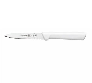 Streamline Culinary Workflow Effectively with the Mundial W0547-4E Paring Knife. This high-quality knife is designed to enhance efficiency in commercial restaurant kitchens. With its 4" serrated edge and spear point, it effortlessly cuts through fruits, vegetables, and other ingredients, saving valuable time and effort. The high carbon/no stain blade ensures long-lasting durability, while the molded white polypropylene handle provides a comfortable grip for extended use. Additionally, the knife is treated with sanitized antimicrobial protection, ensuring a hygienic food preparation environment. The Mundial W0547-4E Paring Knife is NSF certified, guaranteeing its compliance with strict food safety standards. Whether you're peeling, trimming, or slicing, this knife is a reliable tool that will help you deliver exceptional culinary creations. Trust Mundial, a trusted vendor in the industry, to provide you with the perfect knife for your restaurant's needs.