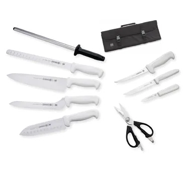 Enhance Culinary Precision Seamlessly with the Mundial, W56-984, Knife Set. This 10-piece set is a must-have for any commercial restaurant. It includes a variety of knives designed to meet the demands of a professional kitchen. The set features a 3-1/4 inch paring knife, a 6-inch utility knife with a serrated edge, a 6-inch curved boning knife, a 7-inch Santoku knife with a granton edge, a 9-inch offset sandwich knife with a serrated edge, a 10-inch chef's knife, a 12-inch slicing knife with a granton edge, and a pair of kitchen shears. The set also includes a 12-inch diamond sharpening steel to keep your knives in top condition. All these tools come neatly packed in a convenient cutlery case, making it easy to transport and store. With the Mundial, W56-984, Knife Set, you'll have everything you need to achieve precision and efficiency in your restaurant kitchen.