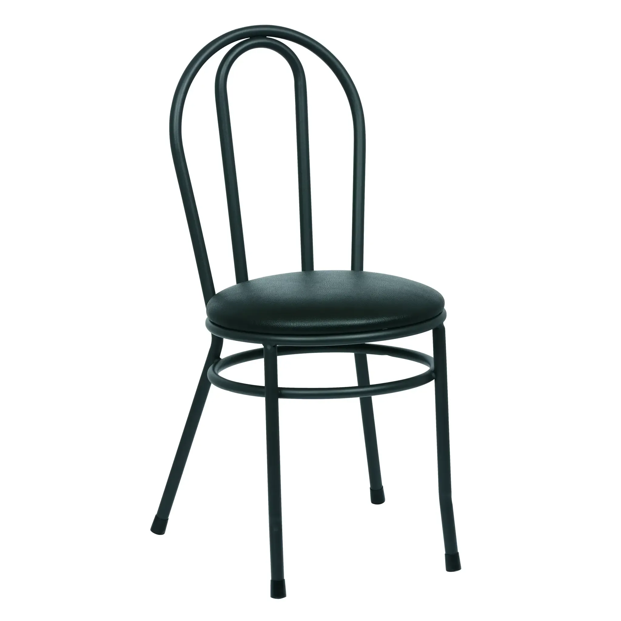 Ensure smooth operations with the Royal Industries, ROY 717 B, Chair, Side, Indoor. This bistro side chair is designed to enhance the dining experience in commercial restaurants. With its hairpin back and 16" diameter plywood seat, it offers both comfort and style. The 1-7/8" thick high-density foam padding ensures that your guests can sit comfortably for extended periods. The 18-gauge steel black frame provides durability and stability, with additional support bars and 14 welds for added strength. The scratch-resistant powder-coated finish ensures that the chair will maintain its sleek appearance even with frequent use. The black vinyl upholstery adds a touch of elegance and is easy to clean. Sold by the case, with a minimum order of 2 chairs, this chair is perfect for outfitting your restaurant with high-quality seating. Trust Royal Industries for reliable and authentic restaurant furniture.